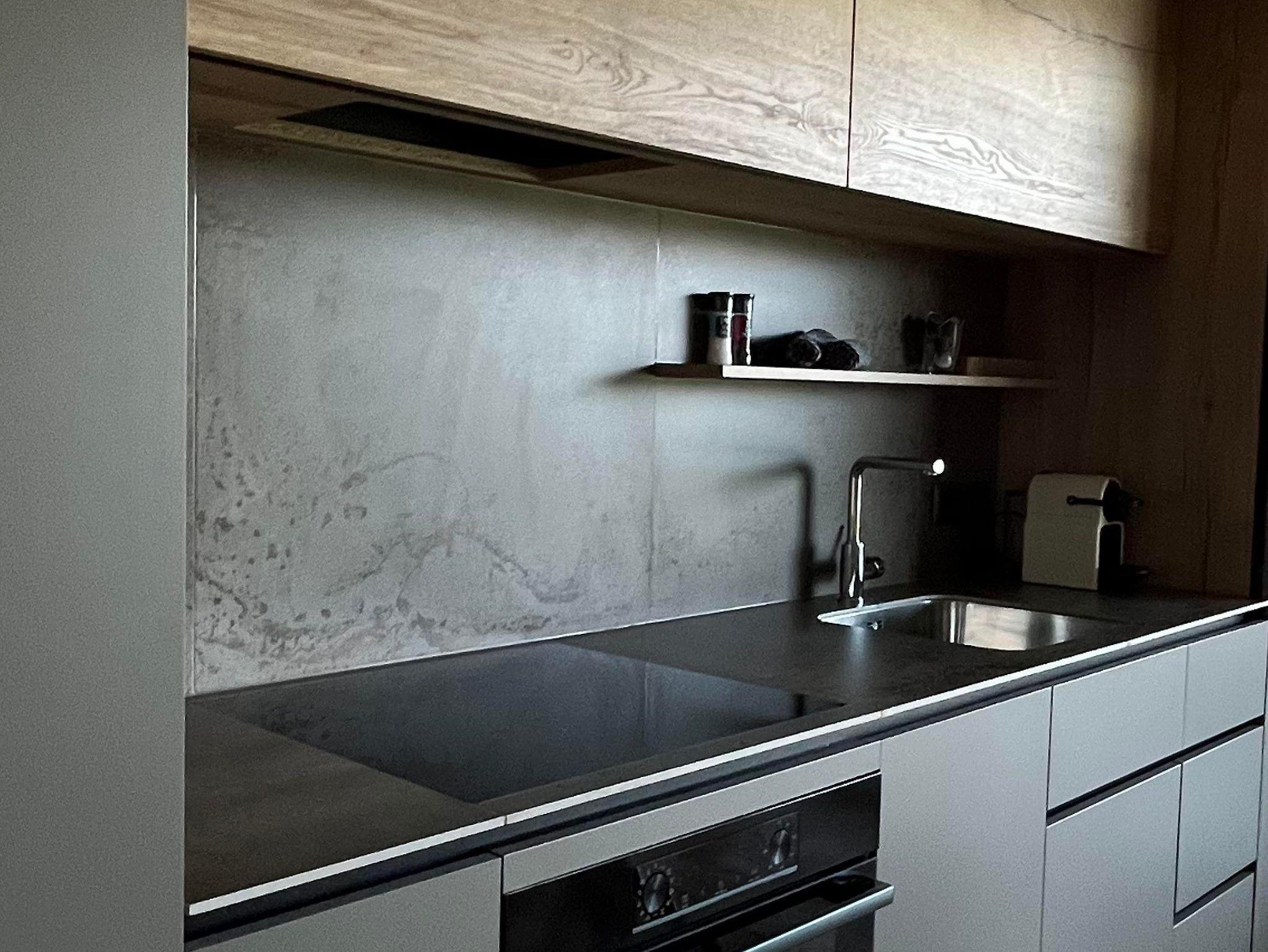 Der Wohnraum besticht mit seiner großen Glasfront, die direkt auf die Terrasse führt. Im Wohnraum befindet sich eine moderne Küche, ausgestattet mit Kühlschrank, Gefrierfach, Ceranfeld, Backrohr, Geschirrspüler, Spüle, Kaffeemaschine und Wasserkocher. Die Küche enthält ein vollständiges Besteck- und Geschirrservice. Der Esstisch, für bis zu 6 Personen, ermöglicht einen einzigartigen Ausblick auf den See während dem Essen. Zum Entspannen lädt die große Couch mit Fernseher ein. Bei mehr als 5 Personen, findet eine weitere Person auf der gemütlichen Ausziehcouch Platz.