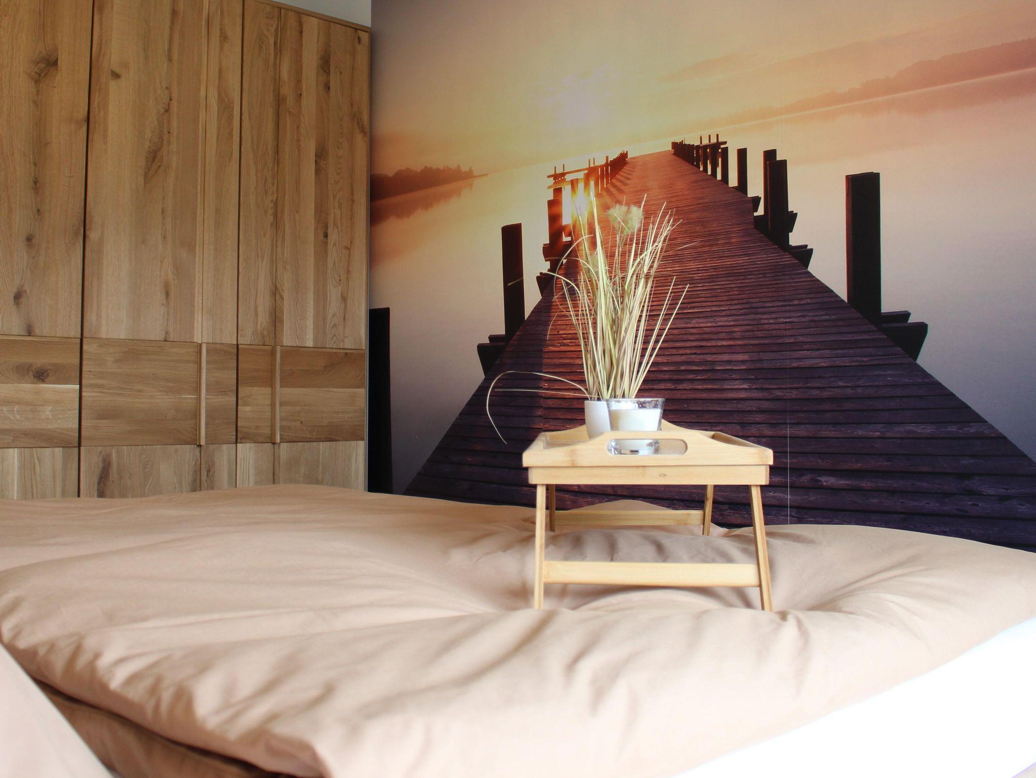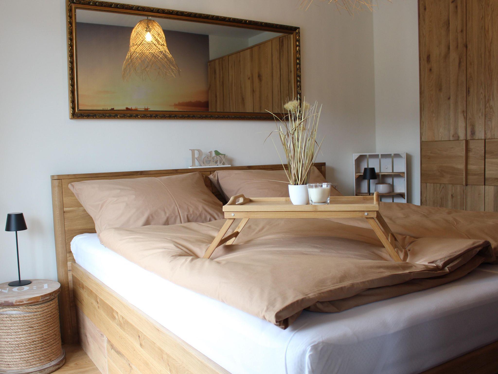 Der Wohn- und Schlafbereich ist mit edlen Eichendielen ausgestattet. Beide Bereiche haben einen direkten Zugang auf die große Südterrasse.