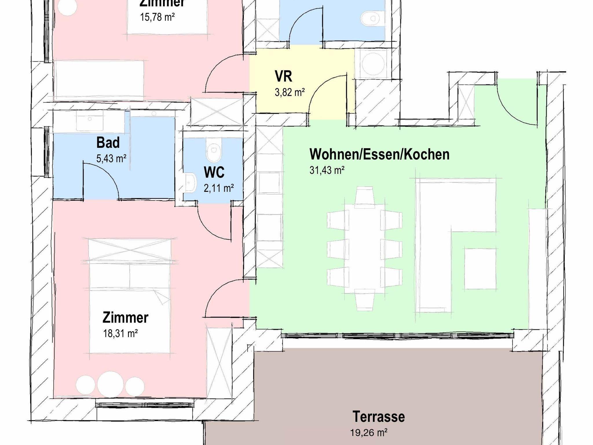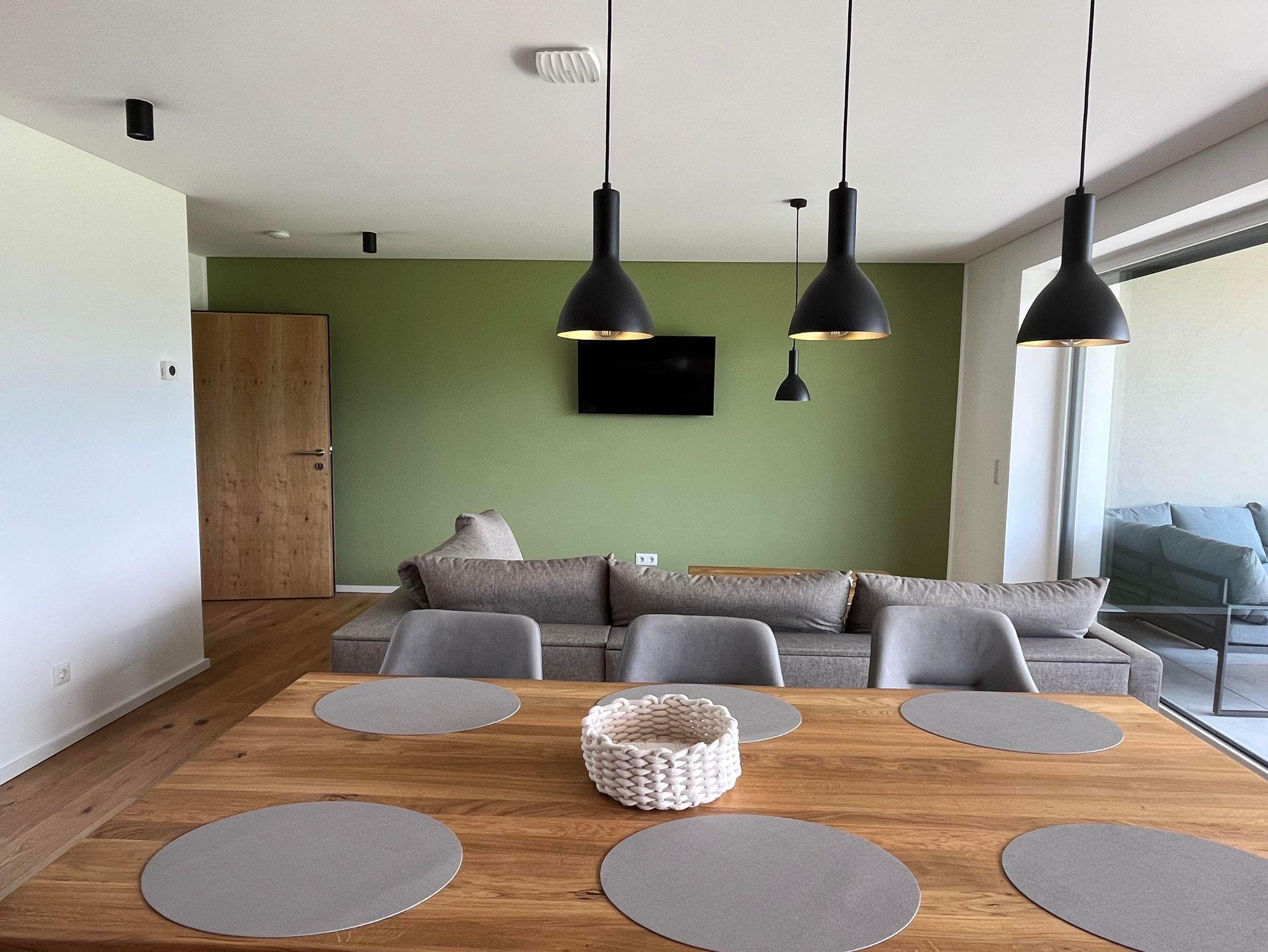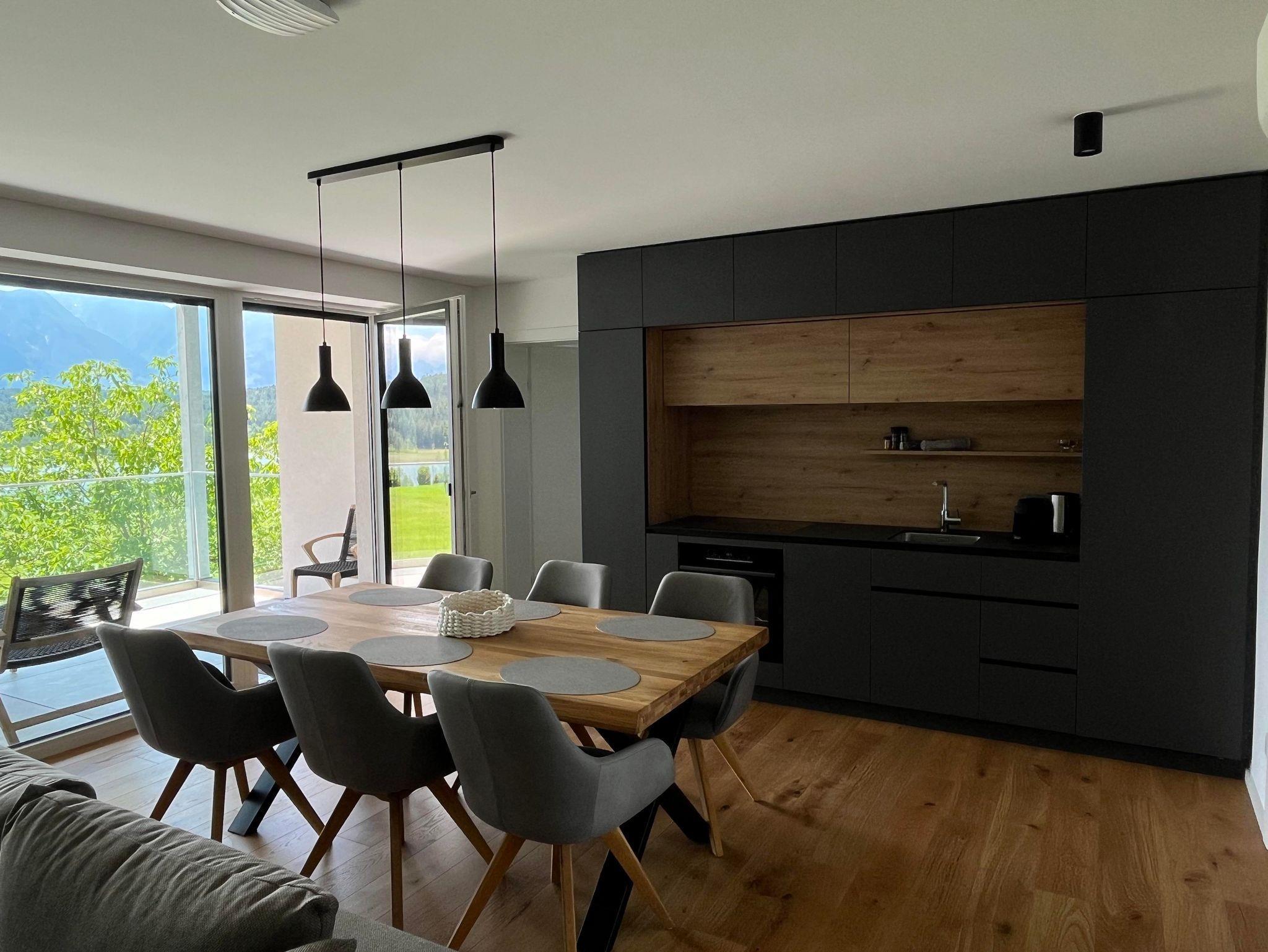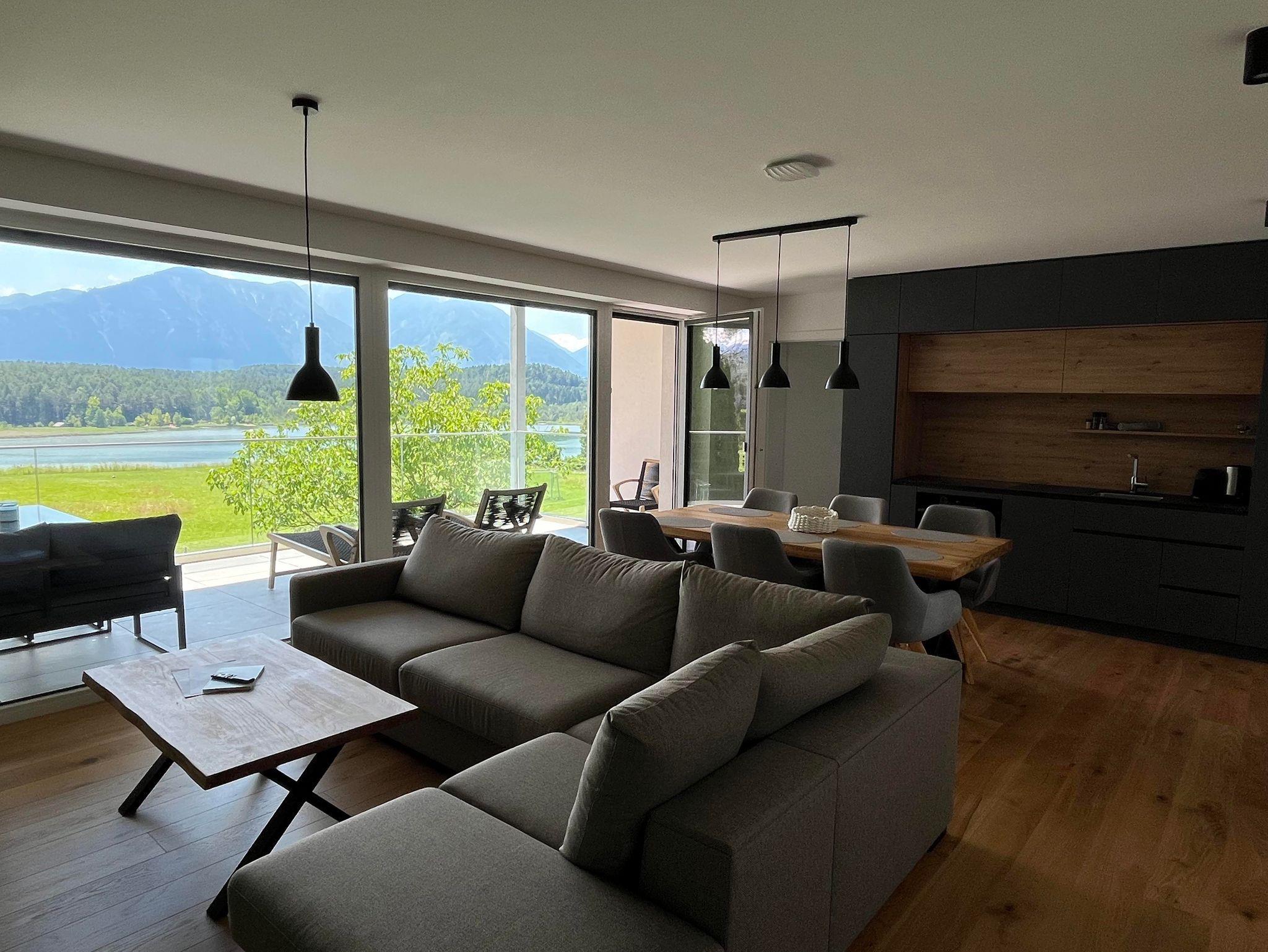 Der Wohnraum besticht mit seiner großen Glasfront, die direkt auf die Terrasse führt. Im Wohnraum befindet sich eine moderne Küche, ausgestattet mit Kühlschrank, Gefrierfach, Ceranfeld, Backrohr, Geschirrspüler, Spüle, Kaffeemaschine und Wasserkocher. Die Küche enthält ein vollständiges Besteck- und Geschirrservice. Der Esstisch, für bis zu 6 Personen, ermöglicht einen einzigartigen Ausblick auf den See während dem Essen. Zum Entspannen lädt die große Couch mit Fernseher ein. Bei mehr als 4 Personen, finden bis zu 2 weitere Personen auf der gemütlichen Ausziehcouch Platz.