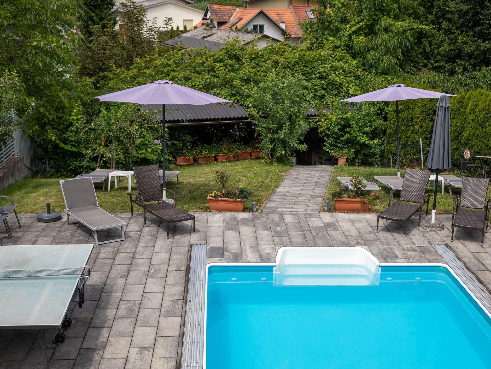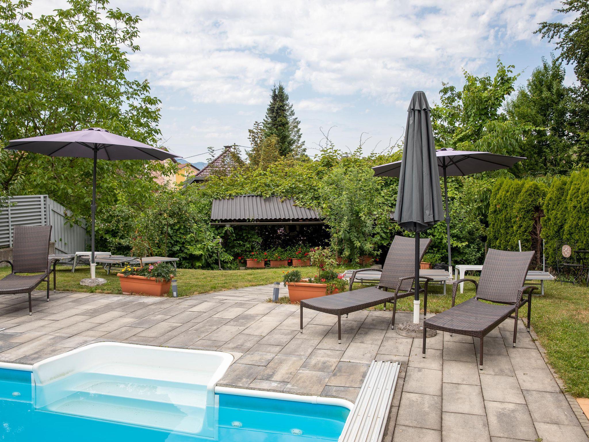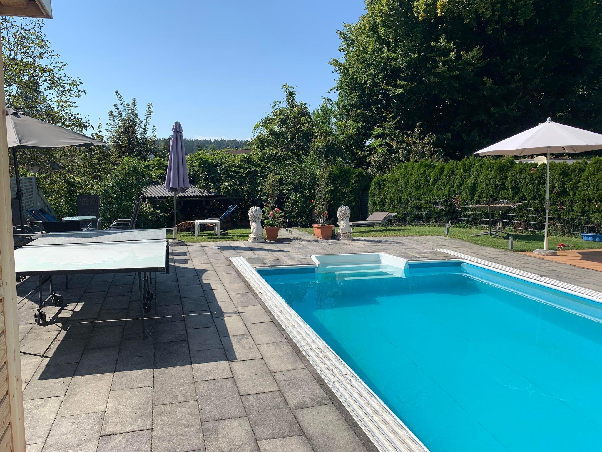 • Allgemeiner Gartenbereich mit Swimmingpool, Liegewiese (30 m²), Gartenlaube mit Grillmöglichkeit, Tischtennis und Sauna: Montag bis Freitag 9 bis 20 Uhr.