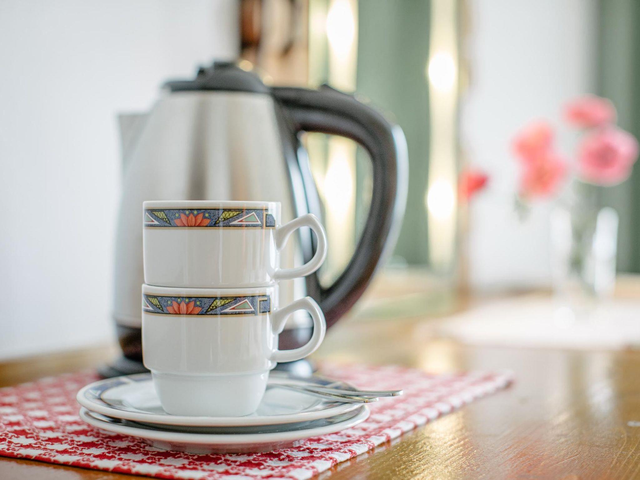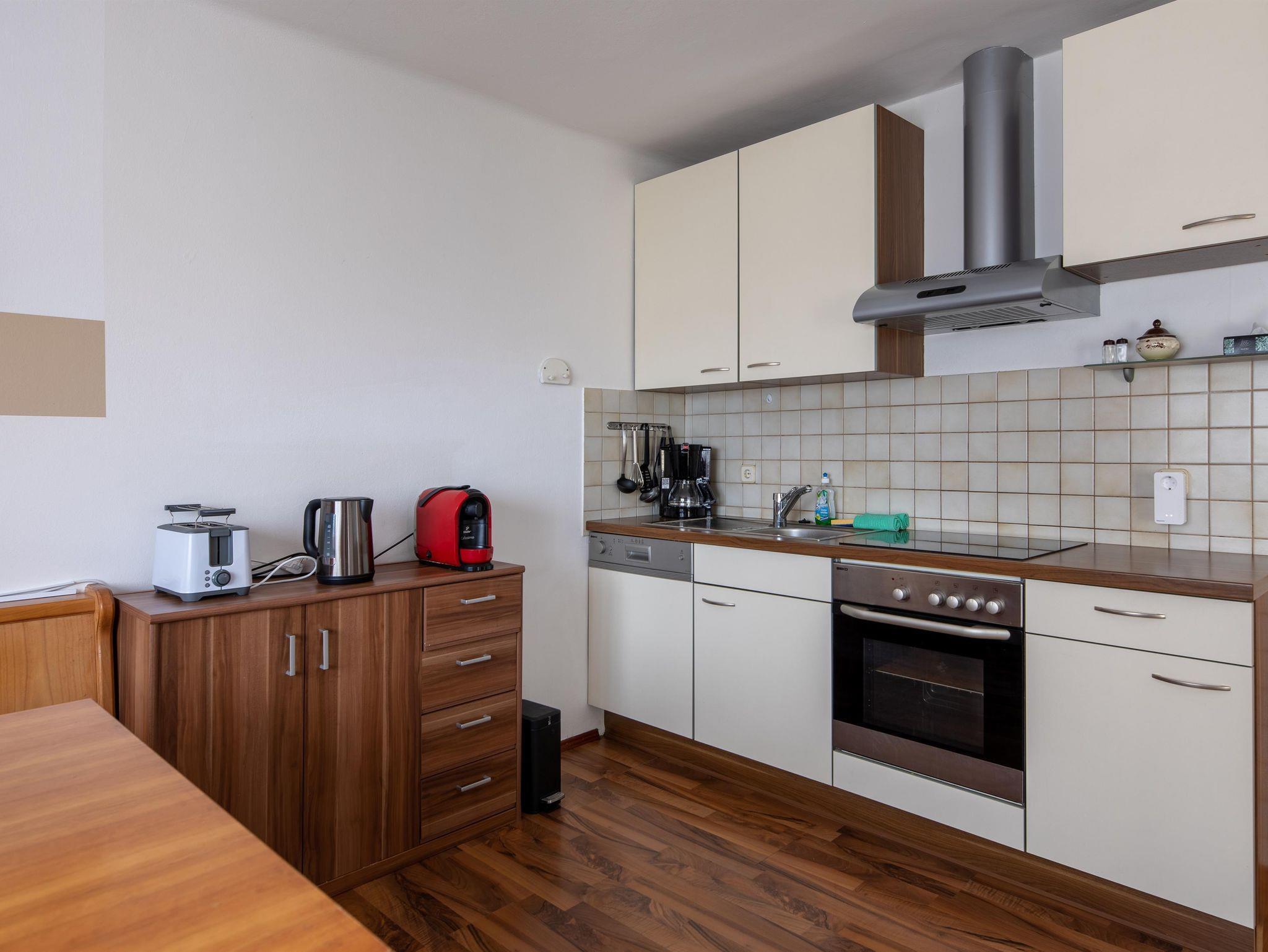 • Gut ausgestatte Kochnische mit Geschirr, Geschirrspüler, Kaffeemaschine (Filter und Kapseln) und Backofen