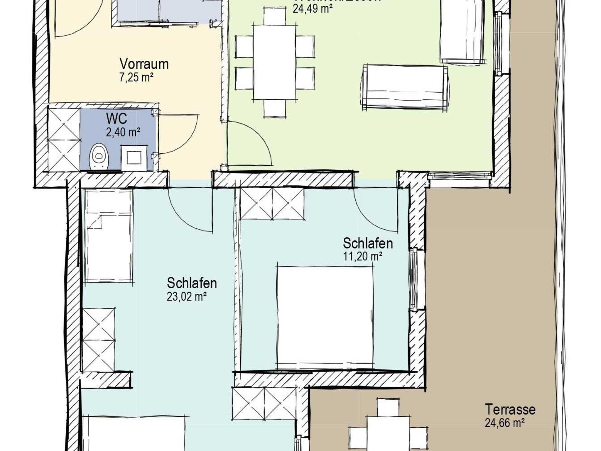 Die Ferienwohnung ist 73m² groß, bietet Platz für sechs Personen und beinhaltet zwei getrennte Schlafzimmer. Eines der Schlafzimmer verfügt über ein Doppelbett, das zweite Schlafzimmer über ein Doppelbett sowie ein Singlebett und einem Schlafsofa. Weiters gibt es ein Wohnzimmer mit einer Essecke, eine Küche, Dusche mit WC und einen Vorraum. Die Wohnung verfügt zusätzlich über eine Sat/TV Anlage, Geschirrspüler, Kaffeemaschine, Küchenutensilien, Geschirr-, Handtücher und Bettwäsche. Sie liegt im Tiefparterre und ist an einen Garten angeschlossen, der ausschließlich für diese Wohnung zur Verfügung steht. Im Garten befinden sich Liegestühle sowie Sitzmöglichkeiten unter einem schattenspendenden Nussbaum.