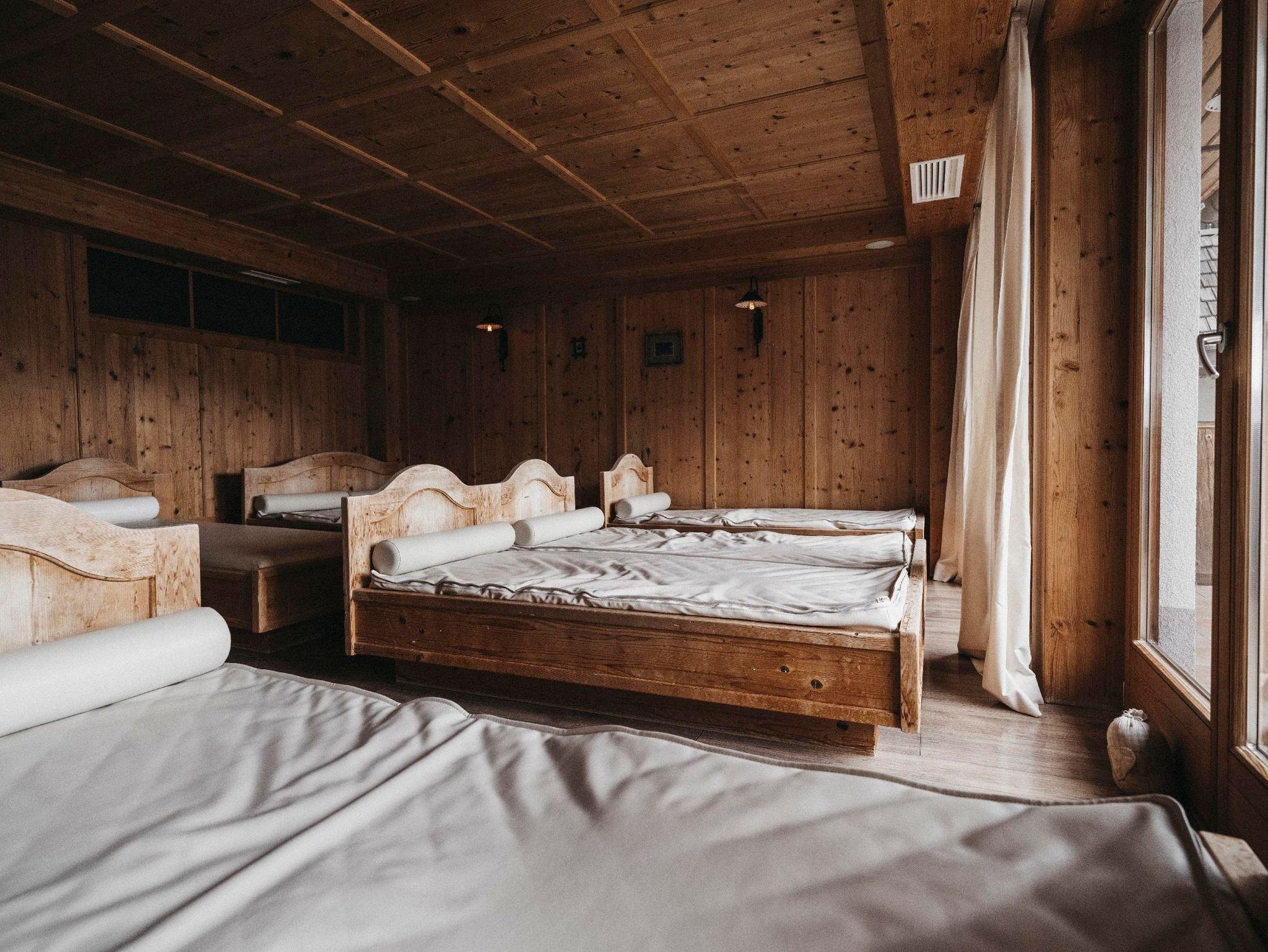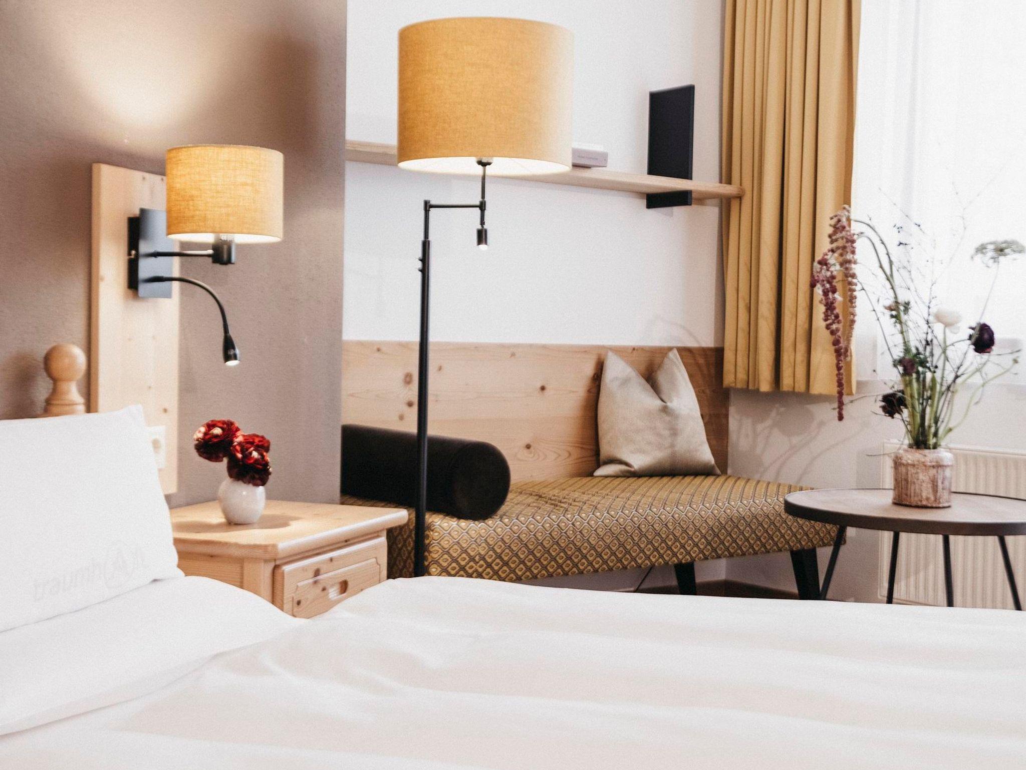 Almwellness-Zimmer (Nichtraucher): 35 m²+6 m² Balkon für 2 Personen, Sitzecke, Bad und Dusche, Doppelwaschbecken, getrenntes WC mit Bidet, Haarfön, beleuchteter Schminkspiegel, Sat-Tv, Radio-Tv, Zimmersafe, Telefon, Stromfreischaltung, Naturholzmöbel