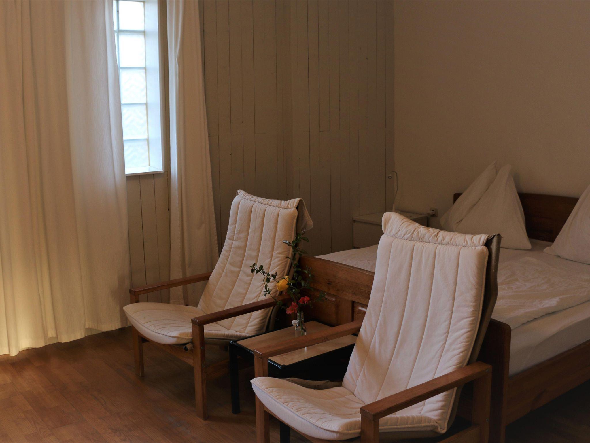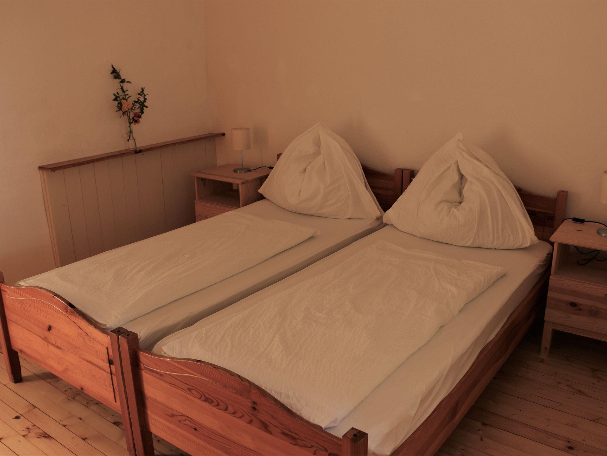 2-Zimmer-Appartement mit Dusche/WC, Kühlschrank & Wasserkocher, 1 Schlafzimmer mit Doppelbett und Balkon nach Westen (Blick auf den Garten) sowie 1 Schlafzimmer mit 1 Doppelbett und 2 Einzelbetten nach Osten.