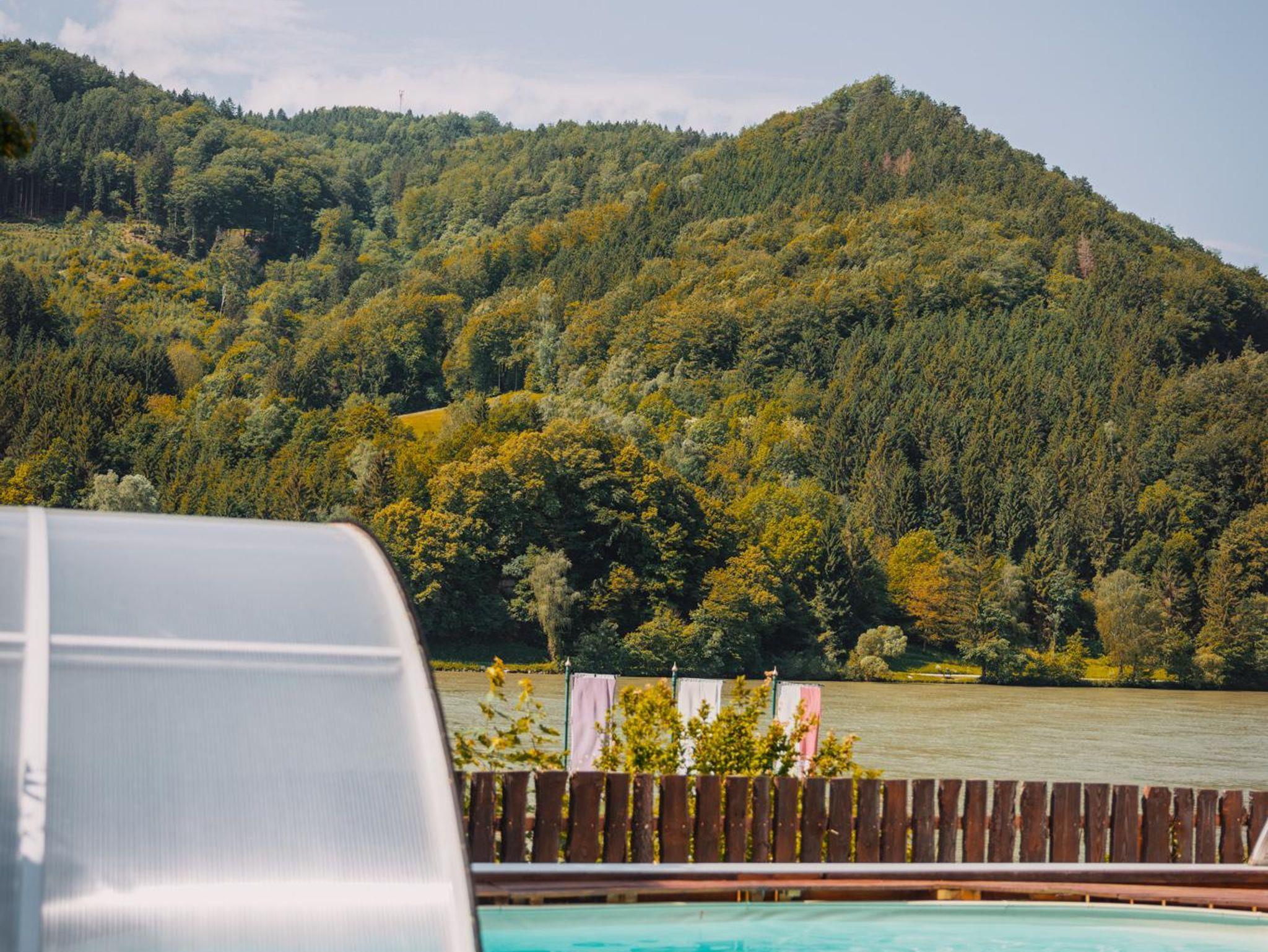 Oder ihr genießt einfach den Pool trinkt einen Cocktail und schaut den Booten zu die die Donau auf und ab fahren