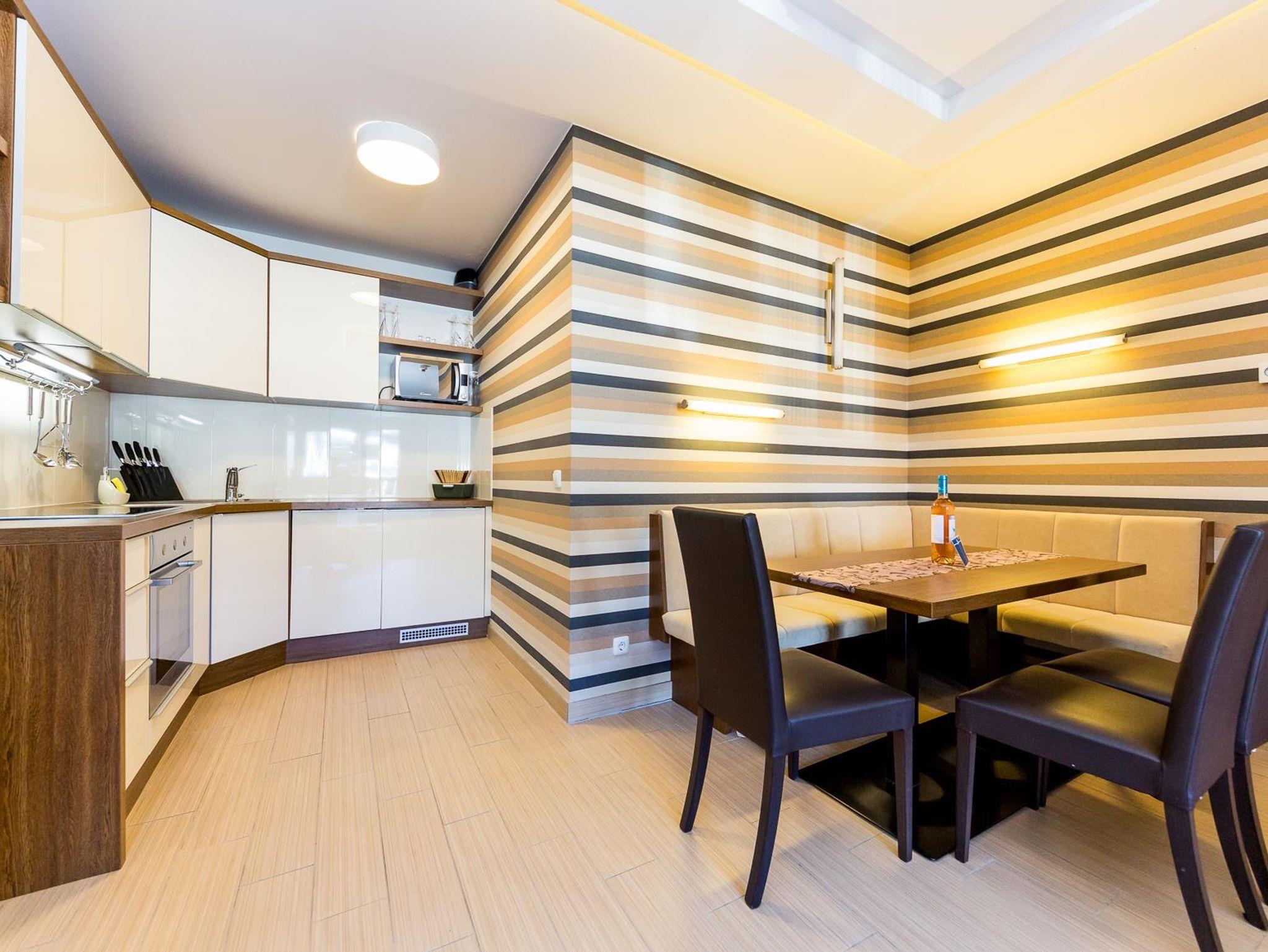 Appartement mit Wohnzimmer und separatem Schlafzimmer mit einem Doppelbett und mit einem ausziehbaren Sofa. Das Wohnzimmer beinhaltet eine Essdiele, eine komplett ausgestattete Kochecke und ein Badezimmer mit Dusche. Zum Appartement gehört auch eine Terrasse (9m2). Eigene Sauna im Appartement. TV ist für Internetbenutzung geeignet: kostenloses Internet, TV Kanäle. Im Erdgeschoss befindet sich pro Appartement ein Abstellraum. Parkmöglichkeit vor dem Gebäude. 2-4 Personen (48 m2) Gesamtanzahl der Midi Appartements: 2 Ausstattung: Wohnzimmer: LCD TV ( mit Internetanschluss), Tastatur, Sofa, Couchtisch; Küche: Elektroherd mit Zerankochfläche (4 Platten), Ofen, Geschirrspühler, Tellerset, Tafelgeschirr, Gläser, Topfset, Mikrowelle, Toaster, Kaffeemachine, Wasserkocher, Kühlschrank/Gefrierfach, Korkenzieher; Badezimmer: Dusche, Föhn, Handtücher; Sauna: Wassereimer, Löffel; Bettwäsche Mindestaufenthalt: 3 Nächte