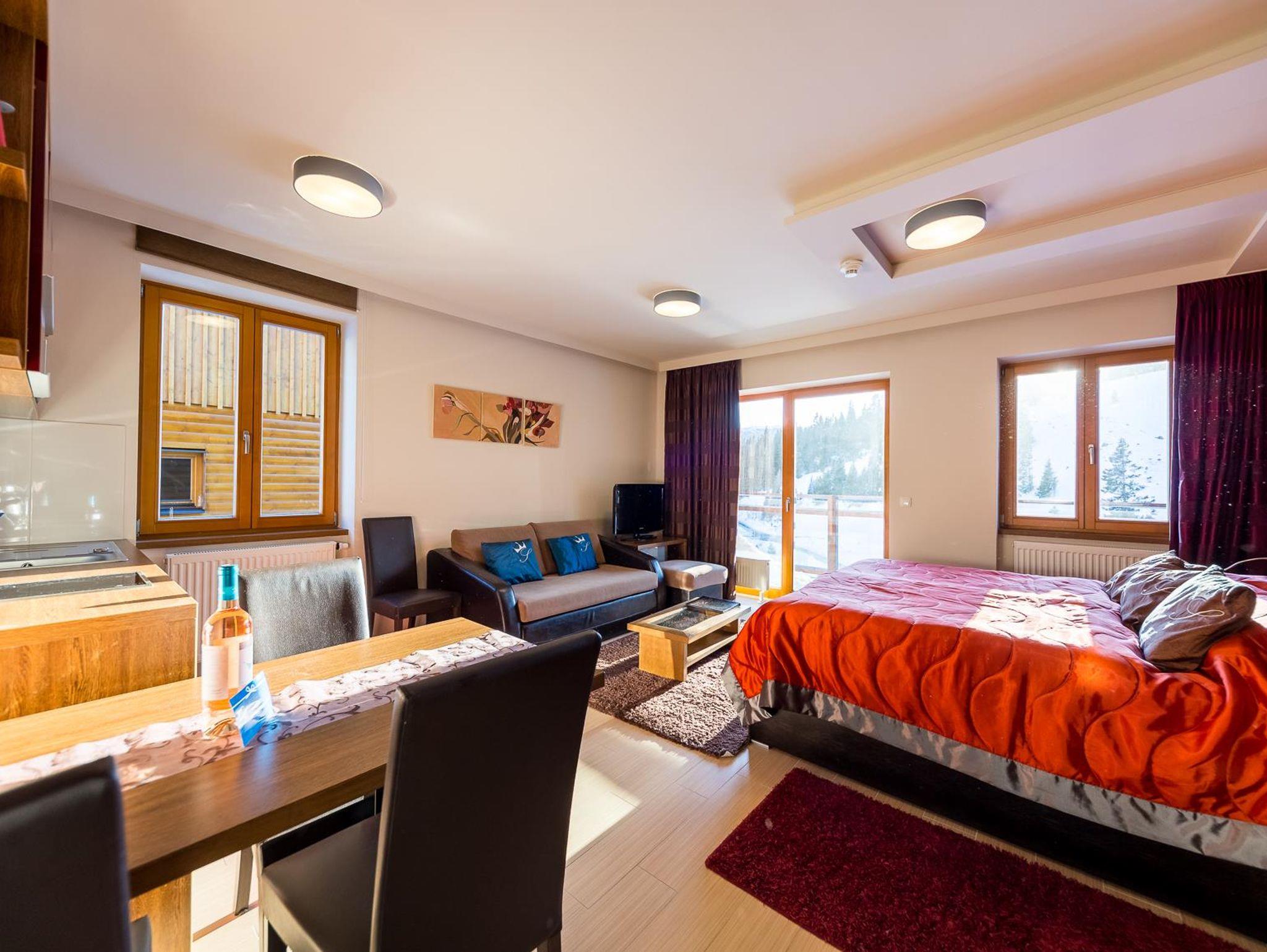 Direkt im Skigebiet In den drei Häusern vom 4+ Sterne Sissi Park erwarten Sie 22 einladende, exklusiv eingerichtete Appartements und zusätzlich 2 Zweibettzimmer und 1 Dreibettzimmer. Sie können das wundervolle Panorama der malerischen Gebirgslandschaft von Ihrer eigenen, südlich liegenden Terrasse genießen. Fast alle unserer Appartements haben eine Sauna im Badezimmer. Jedes Appartement ist mit einem für Internetbenutzung geeigneten LCD TV Gerät ausgestattet. Wifi ist in allen Räumen kostenlos verfügbar. Genießen Sie die gesunde, Pollenfreie Alpenluft, auf einer Höhe von 1650 M. Verpflegung: Frühstück, Abendessen und á la carte kann in unserem Restaurant in Anspruch genommen werden. Die Frühstücksbrötchen werden im Hause frisch gebacken. Rezeption: Bei Fragen wenden Sie sich bitte an unsere Rezeption. Sie können Deutsch, Englisch, oder Ungarisch informiert werden. Internet/TV: Jedes Appartement ist mit einem TV (Deutsch, Englisch und Ungarische Kanäle) ausgestattet. Kostenloses W-LAN im jeden Appartement! Baby Zubehör: Kinderbett und Bettwäsche, Wanne, Hochstuhl, Wickeltisch. Bitte sagen Sie uns noch vor Ankuft Bescheid falls Sie etwas von diesen Sachen benötigen! Parken: Kostenloses Parken vor den Appartements. Alle Appartements sind Nichtraucher-Appartements, Haustiere sind nicht erlaubt.
