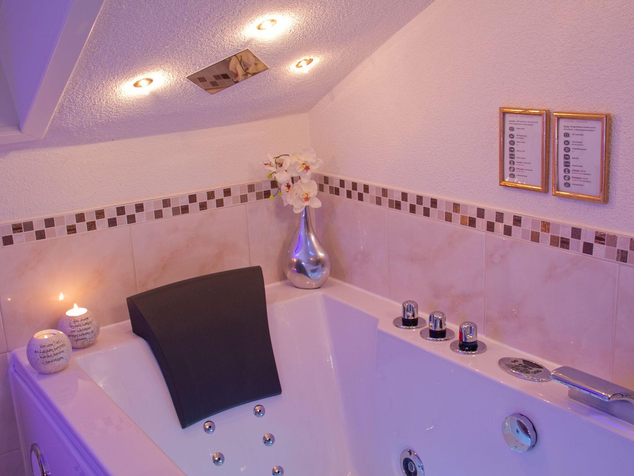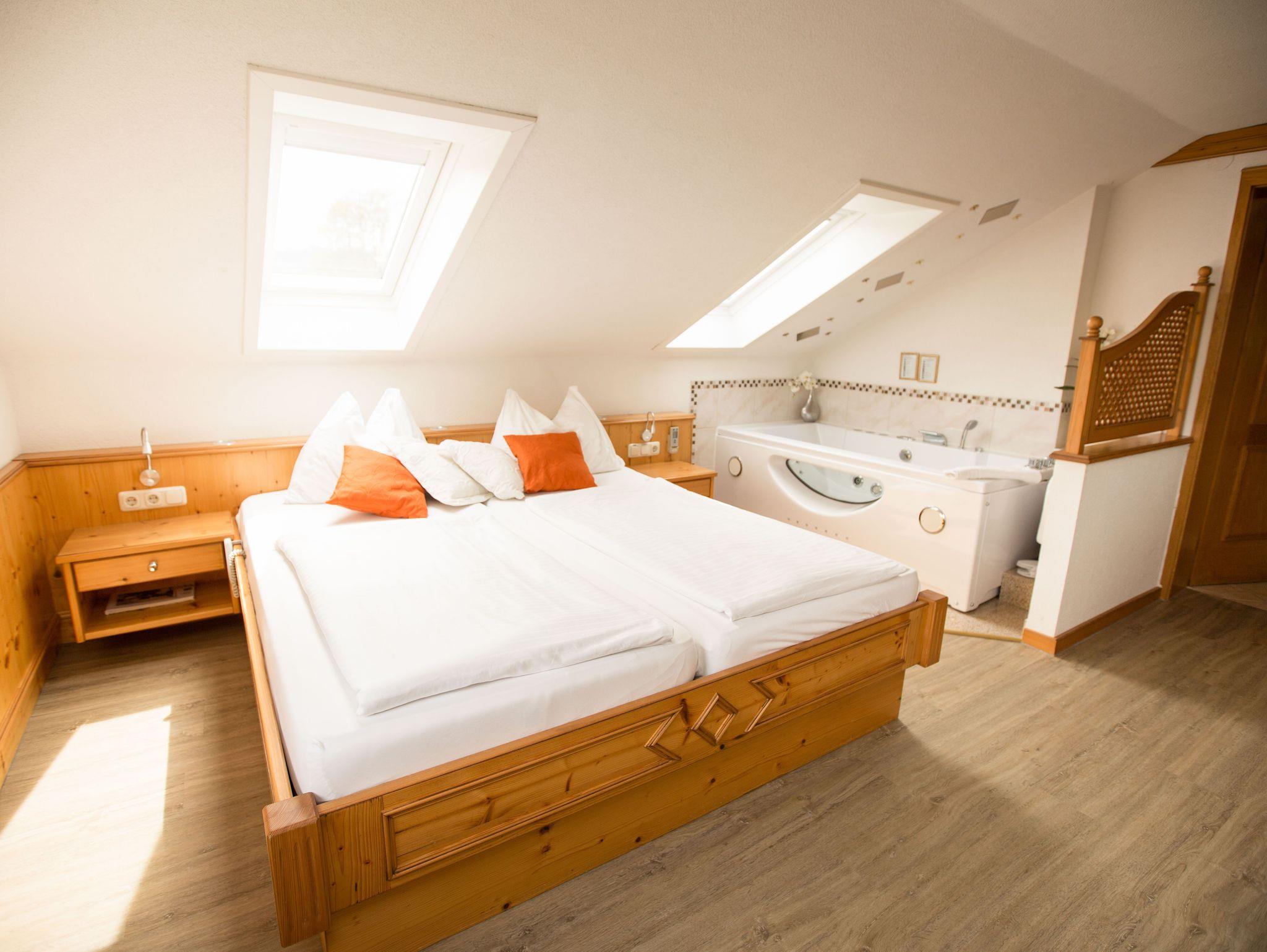 Fühlen Sie sich wie zu Hause in einer ganz besonderen Atmosphäre. Wunderschön lichtdurchflutet und hell mit Blick ins Grüne. Das Besondere: im Whirlpool genießen Sie ganz privat Ihre eigene Wellness mit Blick auf einen großen Flat-Screen (40 Zoll). 25 m2 mit zahlreichen Lichteffekten, Klimaanlage, elektr.verstellbare Betten, Safe, Nespresso Maschine und eine Mini-Bar gehören zur exklusiven Ausstattung. W-lan Anschluß zur freien Verfügung. Badezimmer mit Dusche, WC, Fön und beheiztem Fußboden.