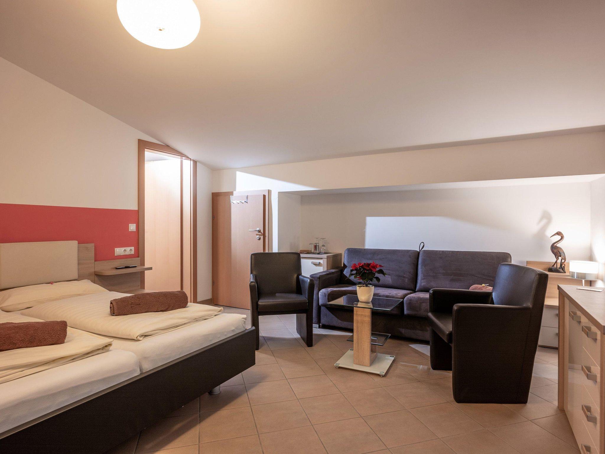 Das moderne Premium-Studioappartement im Dachgeschoss verfügt über einen großzügigen kombinierten Wohn-/Schlafraum, Dusche/WC, Balkon, Küchenbereich, Esstisch, Smart-TV und Glasfaserinternet. Doppelbett und Doppelschlafcouch bieten Übernachtungsmöglichkeit für 2 bis maximal 4 Personen. Der Küchenbereich ist mit Kühlschrank, Mikrowelle/Grill, Cerankochfeld, Senseo Pad-Kaffeemaschine, Essgeschirr und Küchenutensilien ausgestattet. Bettwäsche und Handtücher werden gestellt. Nichtraucherappartement.