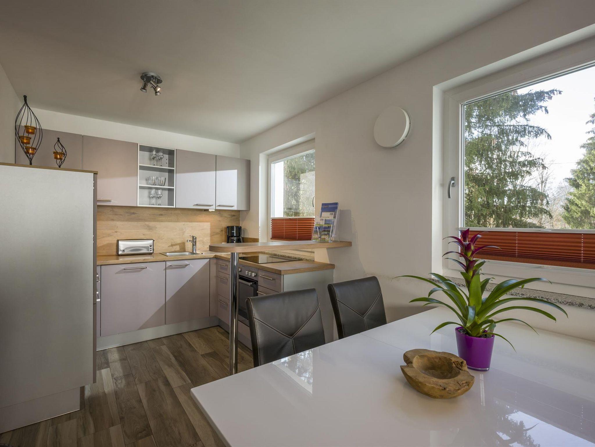 Die Ferienwohnungen sind modern eingerichtet mit Fliesenböden im Holzdekor, Fußbodenheizung und komfortabler Wohnraumlüftung. Die Einrichtung ist hochwertig und aufeinander abgestimmt. Alle Einheiten verfügen über voll ausgestattete Küchen mit Essgeschirr und Küchenutensilien.