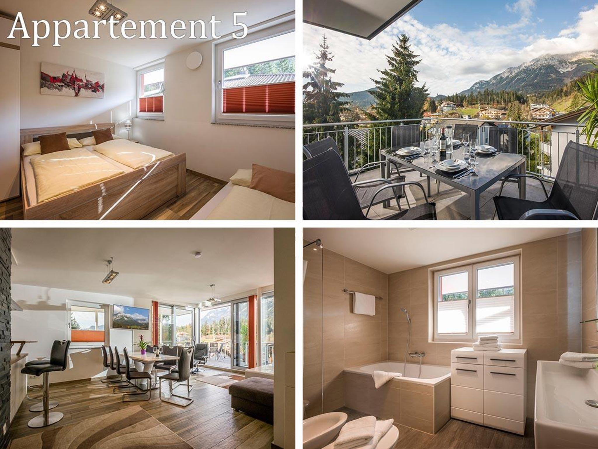 Das luxuriöse 104-qm Panorama Penthouse-Appartement für 6-8 Gäste bietet 2 Schlafzimmer mit Doppelbett und optionalem Einzelbett. Im Wohnbereich mit Panoramaverglasung befindet sich eine Doppelschlafcouch. Die Einbauküche ist voll ausgestattet mit Spülmaschine, Ess- und Kochgeschirr sowie einer offenen Bartheke. Eine riesige Dachterrasse erlaubt großartige Blicke auf den Wilden Kaiser. Badezimmer und extra Toilette. Die Wohnung kann mit dem separat buchbaren Studio-Appartement kombiniert werden.