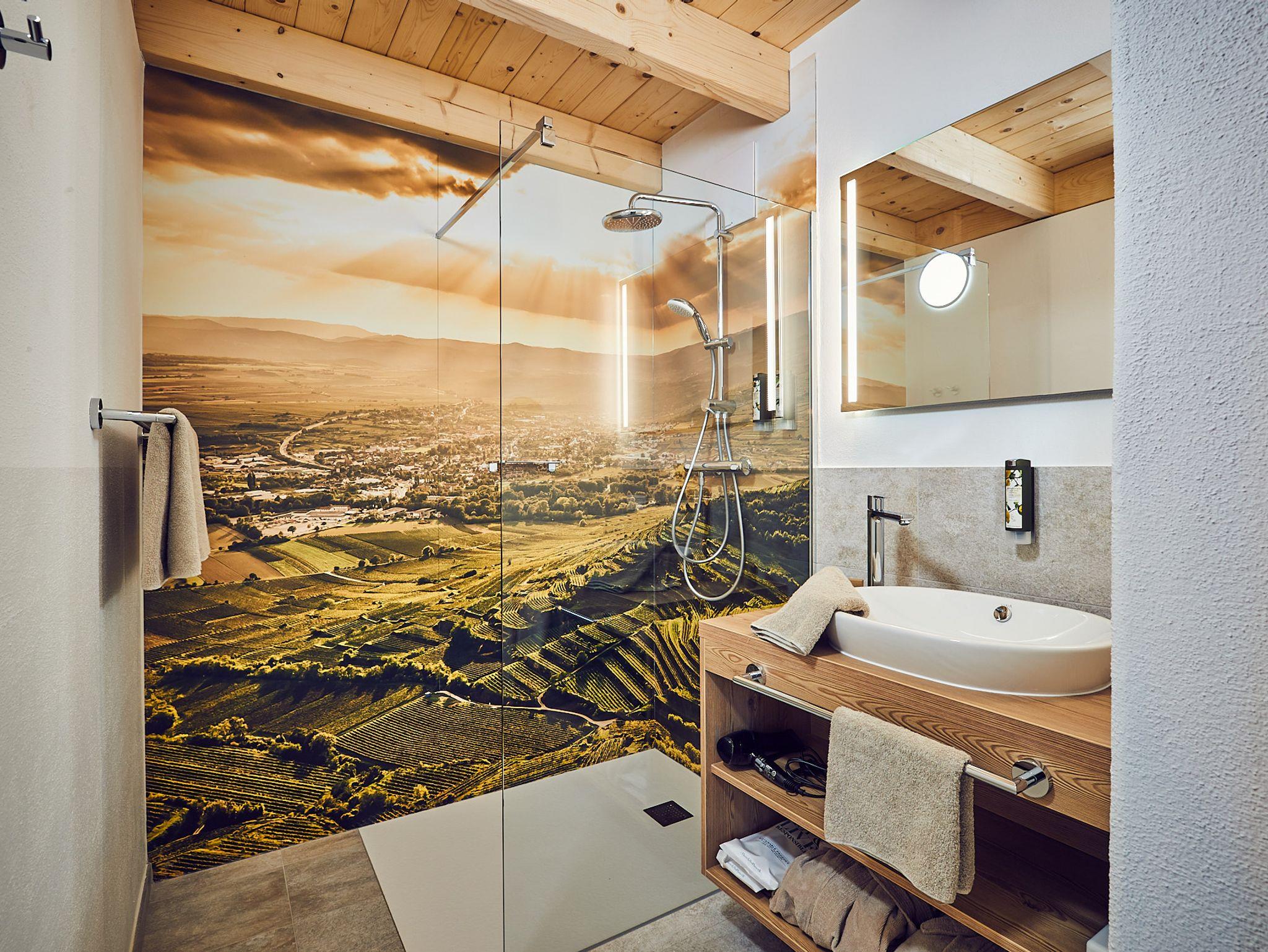 Unsere Winzerstöckl mit 40 m² verfügen über einen gemütlichen Wohn/Schlafbereich, Bad mit Regendusche und getrennter Toilette. Falls Sie Lust zum Kochen bekommen, die Winzerstöckl bieten eine Küchenzeile ausgestattet mit einem 2 flammigen Herd, Mikrowelle mit Heißluft und Grillfunktion, Kühlschrank samt Gefrierfach, Geschirrspüler, Kaffeemaschine, Wasserkocher, hochwertigem Geschirr, Weingläsern und vielem mehr. Auf Ihrer Terrasse wartet der eigene Tischgrill auf seinen Einsatz bei Ihrem gemeinsamen Grillabend am See. Auch für heiße Sommertage ist gesorgt, zusätzlich zur Abkühlung im Gartensee sind alle unsere Chalets mit Klima-Anlage ausgestattet. Natürlich steht unseren Gästen auch kostenfreies WLAN und in jedem Chalet ein 43 Zoll TV zur Unterhaltung bereit. Und die Feuerwasserwanne lädt zu einem warmen Bad unter dem Sternenhimmel ein.