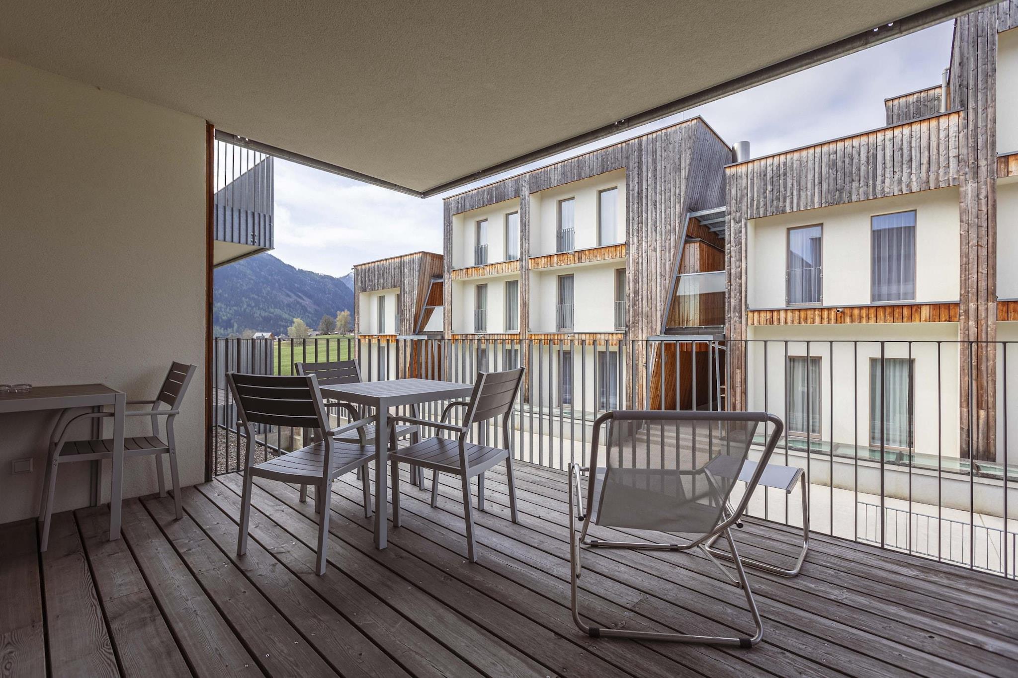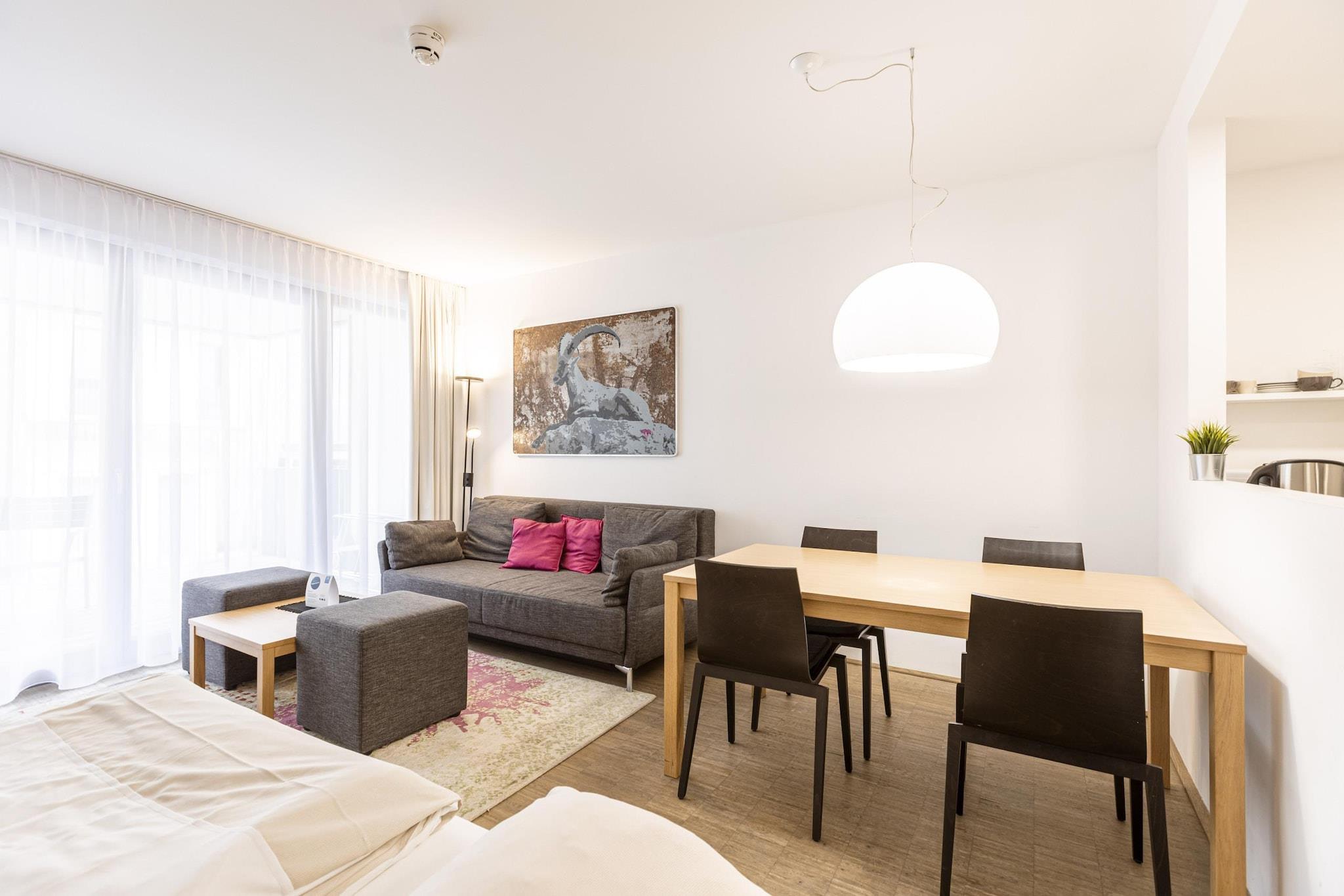 "Velkommen til dit stilfulde tilflugtssted i Alpenrock Schladming! Denne moderne lejlighed på 67 m² rummer komfortabelt op til 6 gæster og tilbyder en blanding af moderne bekvemmeligheder og alpin charme i den fortryllende Schladming-Dachstein-region. Et af højdepunkterne ved denne lejlighed er dets møblerede tag terrasse, der tilbyder et perfekt sted at nyde den betagende udsigt over det omkringliggende landskab eller slappe af i den friske alpine luft. Lejligheden er bekvemt beliggende kun 200 meter fra skibakken og giver nem adgang til vintersport og udendørsaktiviteter. Lejligheden har to indbydende soveværelser, der hver er indrettet med en komfortabel dobbeltseng for at sikre en god nats søvn. For yderligere indkvartering er en dobbelt sovesofa tilgængelig i den rummelige stue. Det veldesignede badeværelse har et badekar, perfekt til at slappe af efter en aktiv dag i bjergene. Træd ind i det fuldt udstyrede, åbne køkken, hvor du finder alt, hvad du behøver for at tilberede måltider, inklusive en keramisk kogeplade, ovn, opvaskemaskine og køleskab med fryser. Vigtige køkkenredskaber såsom bestik, køkkengrej, en brødrister, kedel og kaffemaskine er til rådighed Ved din ankomst, vil du finde et lille startsæt med opvaskemaskiner, opvaskemiddel, en svamp, affaldsposer, en rengøringsklud og et viskestykke til din bekvemmelighed. Hovedbygningen har et wellnessområde med sauna og afslapningsrum samt fællesrum til socialt samvær. Gratis Wi-Fi og satellit-tv er inkluderet for at holde dig forbundet og underholdt under hele dit ophold. Bemærk venligst, at alle billeder er eksempelbilleder, da hver lejlighed er unikt indrettet for at tilbyde en personlig oplevelse."