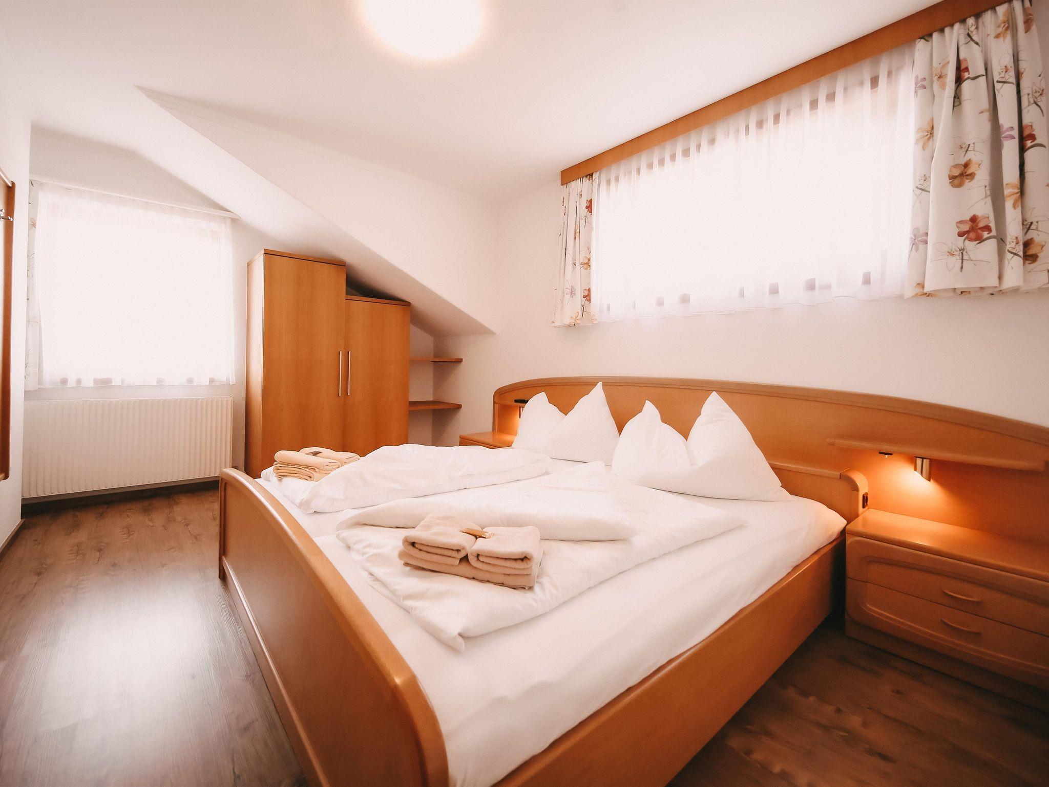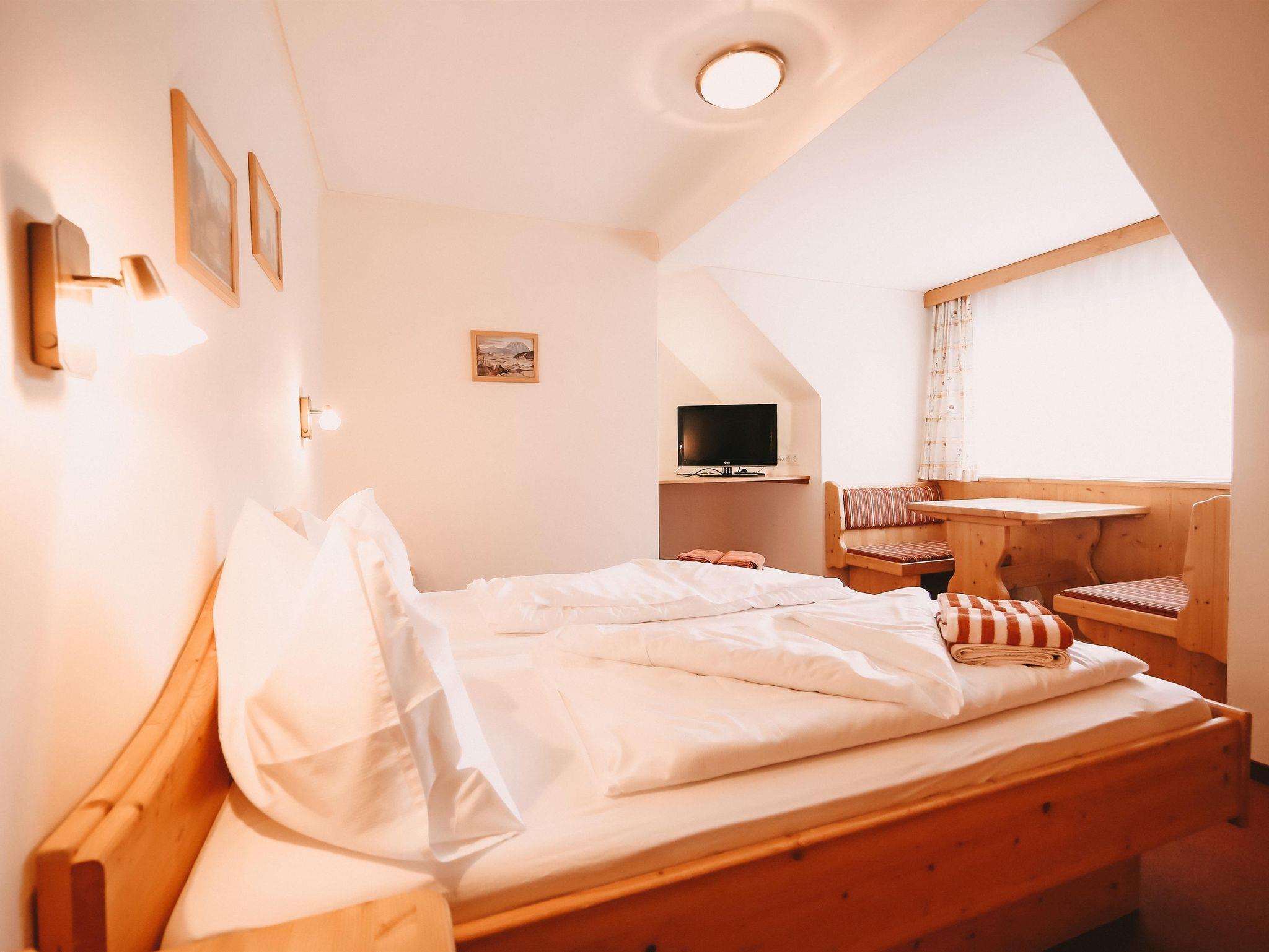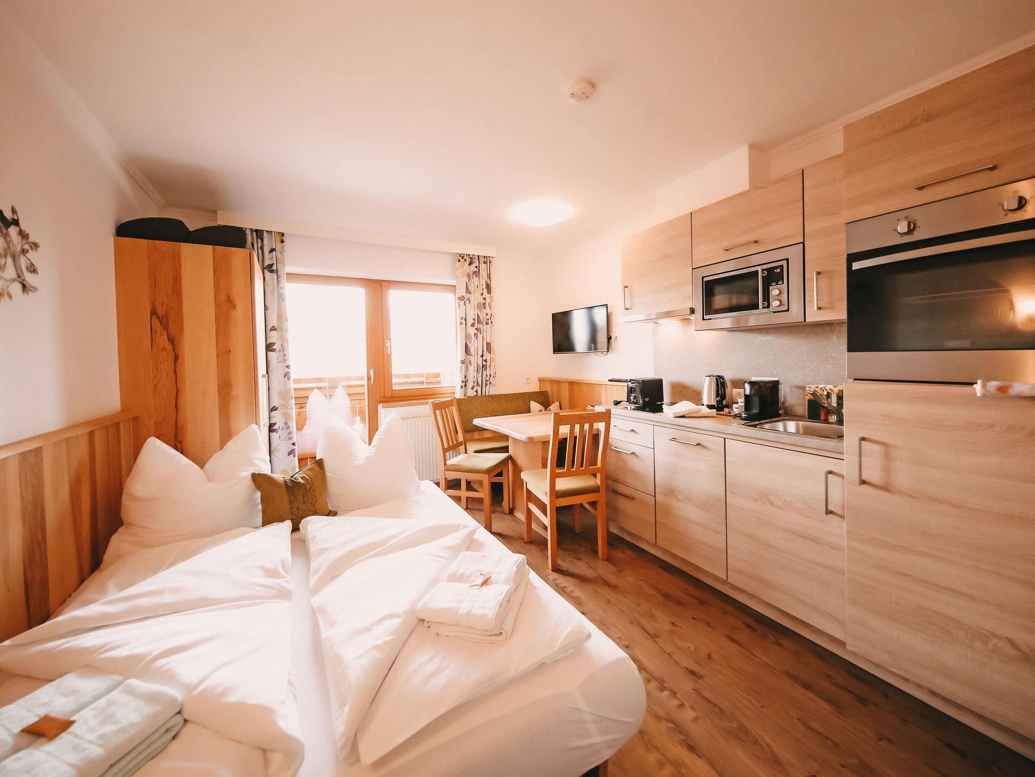 Appartement im Appartementhaus mit einem Doppelzimmer und einem Schlafsofa für zwei Personen in der Wohnküche. Der Balkon zeigt Richtung Dachsteinmassiv.