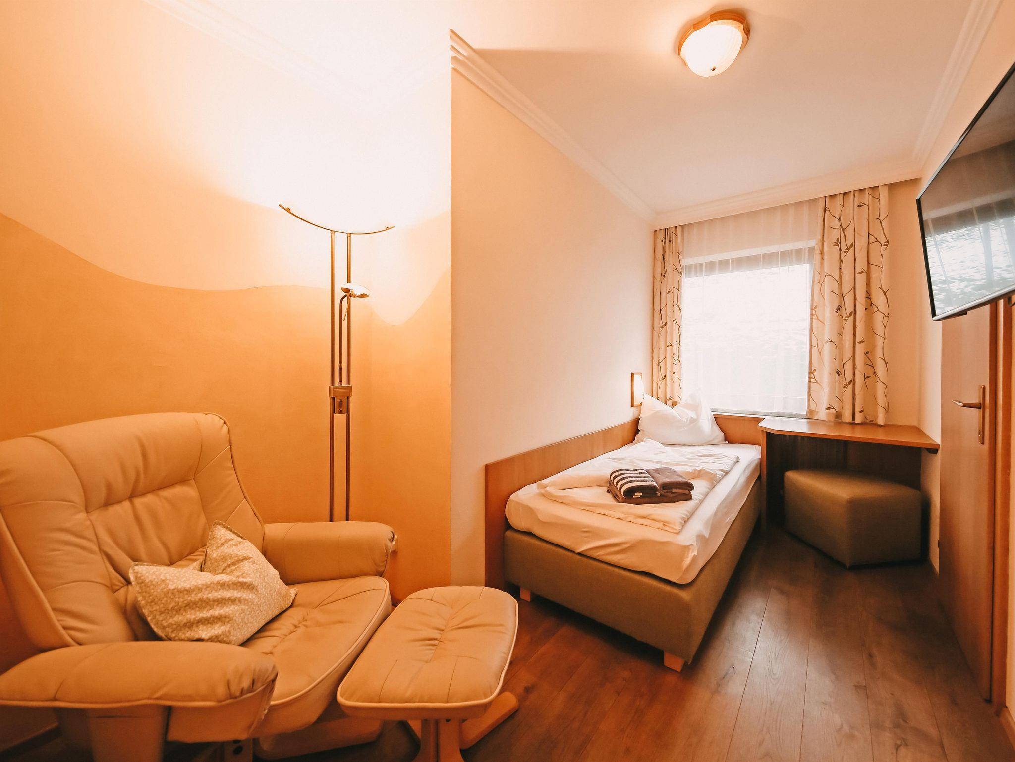 kleines Einzelzimmer im Stammhaus ohne Balkon, mit Dusche und WC. Ideal als Ergänzung zu unseren Appartements aber auch für Einzelreisende.