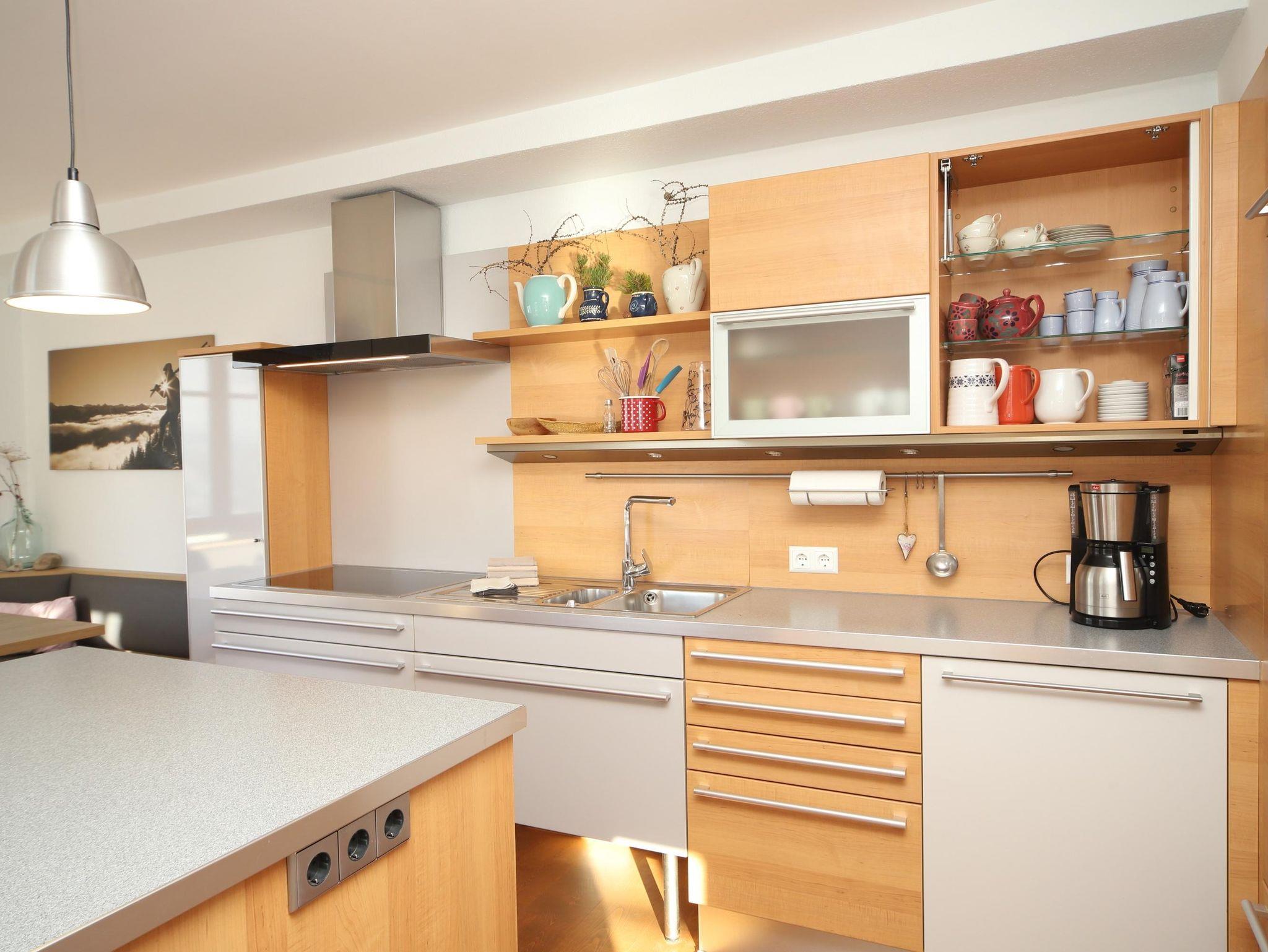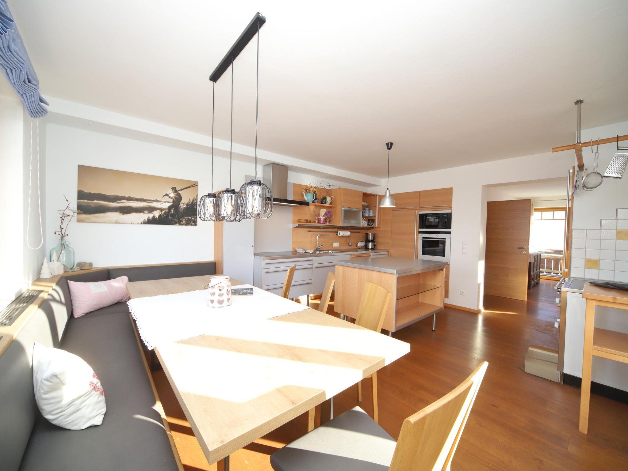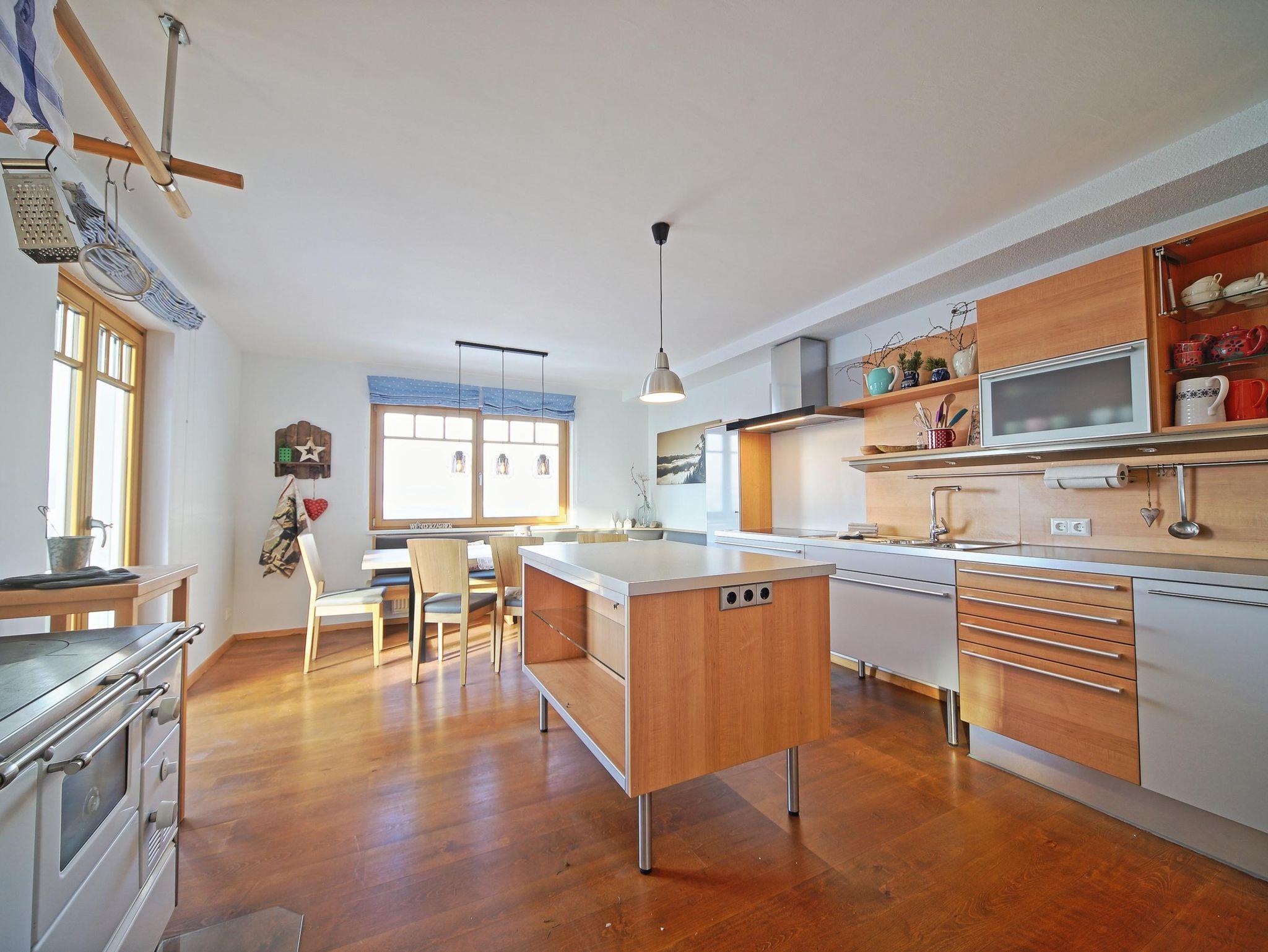 Ein großer Wohnbereich lädt mit voll ausgestatteter Küche und einem großen Esstisch ein.