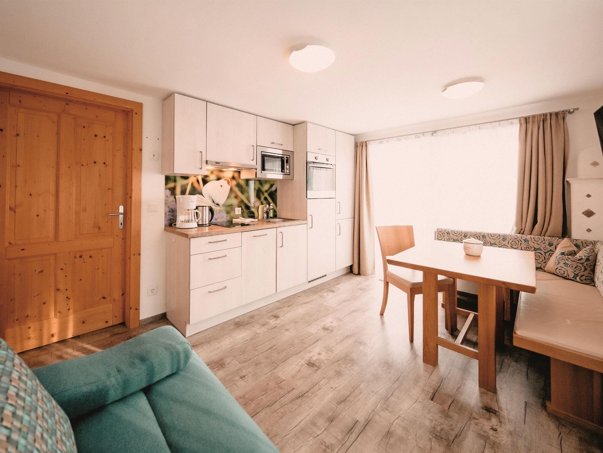 kleines Appartement im Bauerhaus mit Doppelzimmer, einer gemütlichen Wohnküche mit Esstisch, Schlafsofa und Kachelofen.