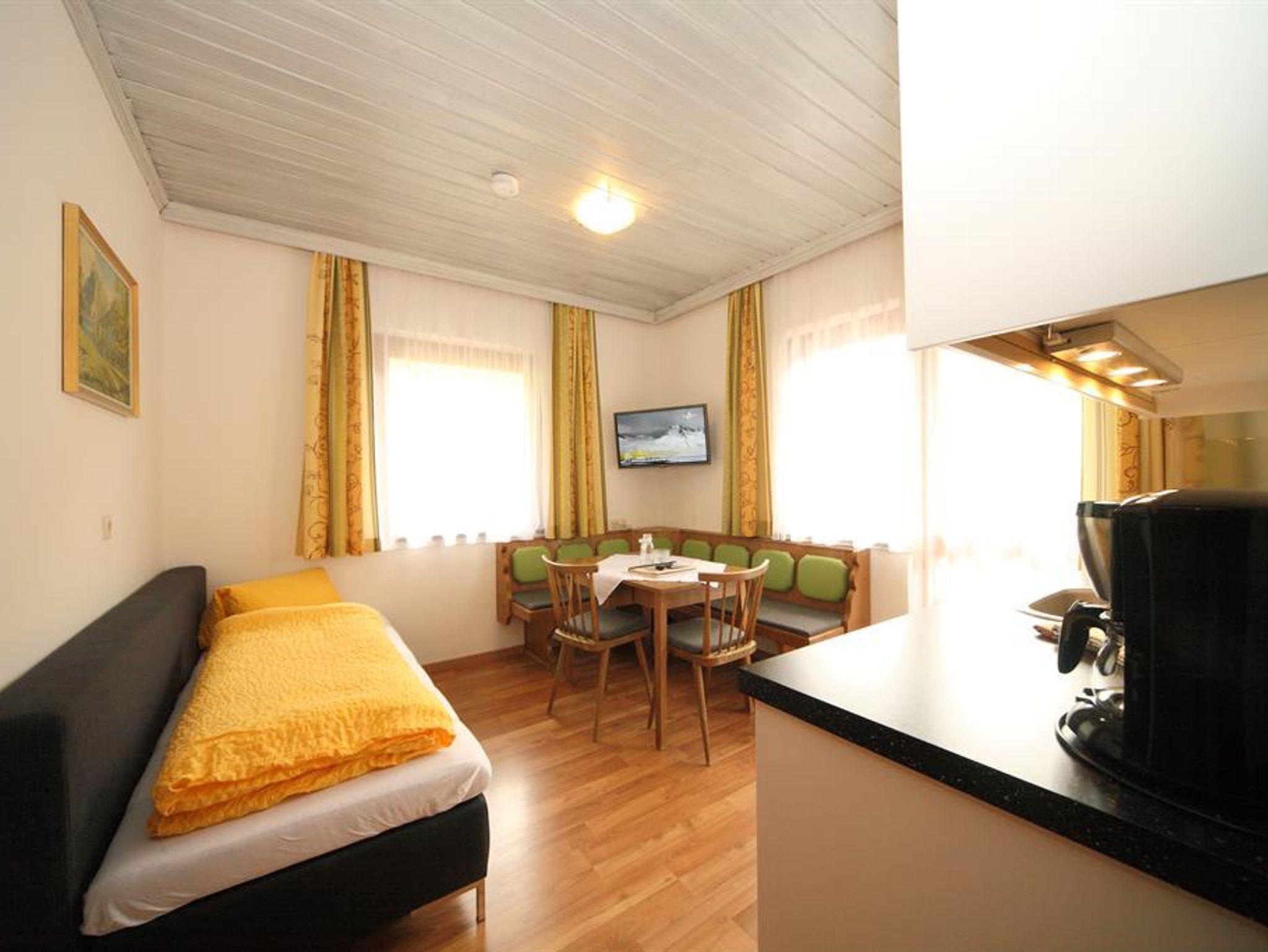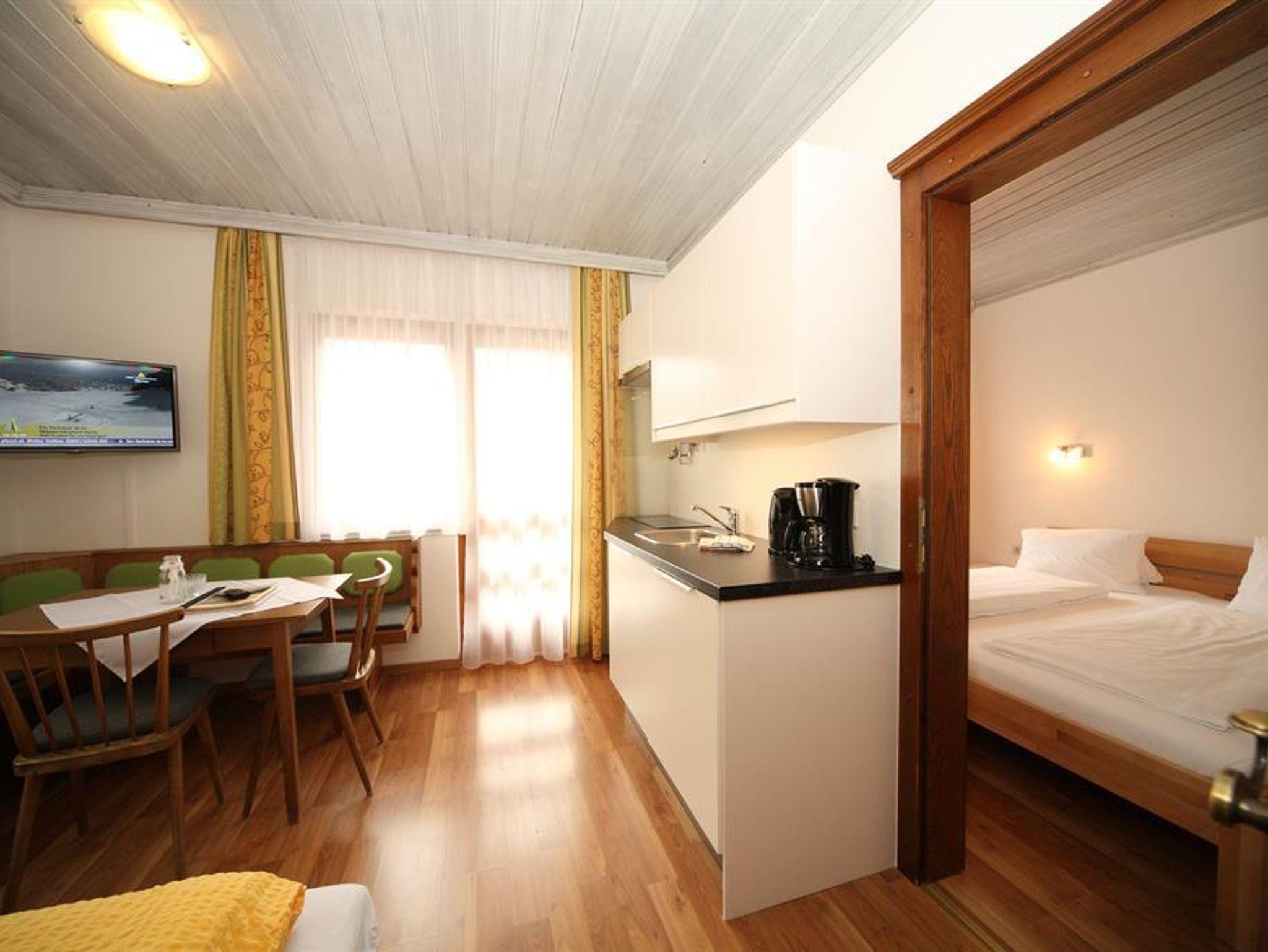 Das Appartement hat eine Wohnküche mit Kochnische und Sitzecke und einer Schlafcouch(für die dritte Person) ein Schlafzimmer mit Doppelbett und ein Badezimmer mit Dusche und WC. Der Balkon ist zur Hofseite raus mit Morgensonne.
