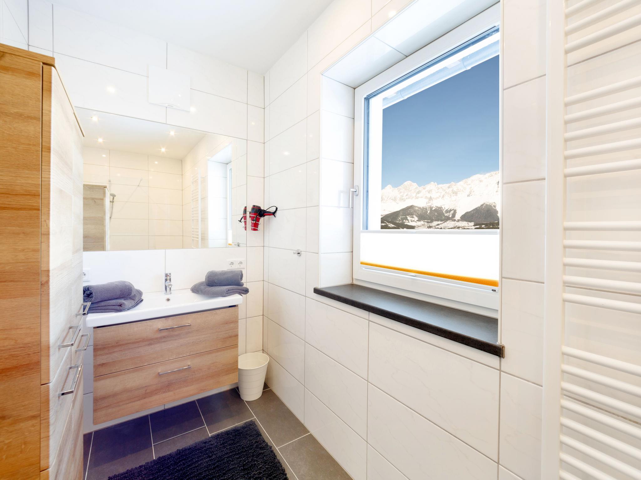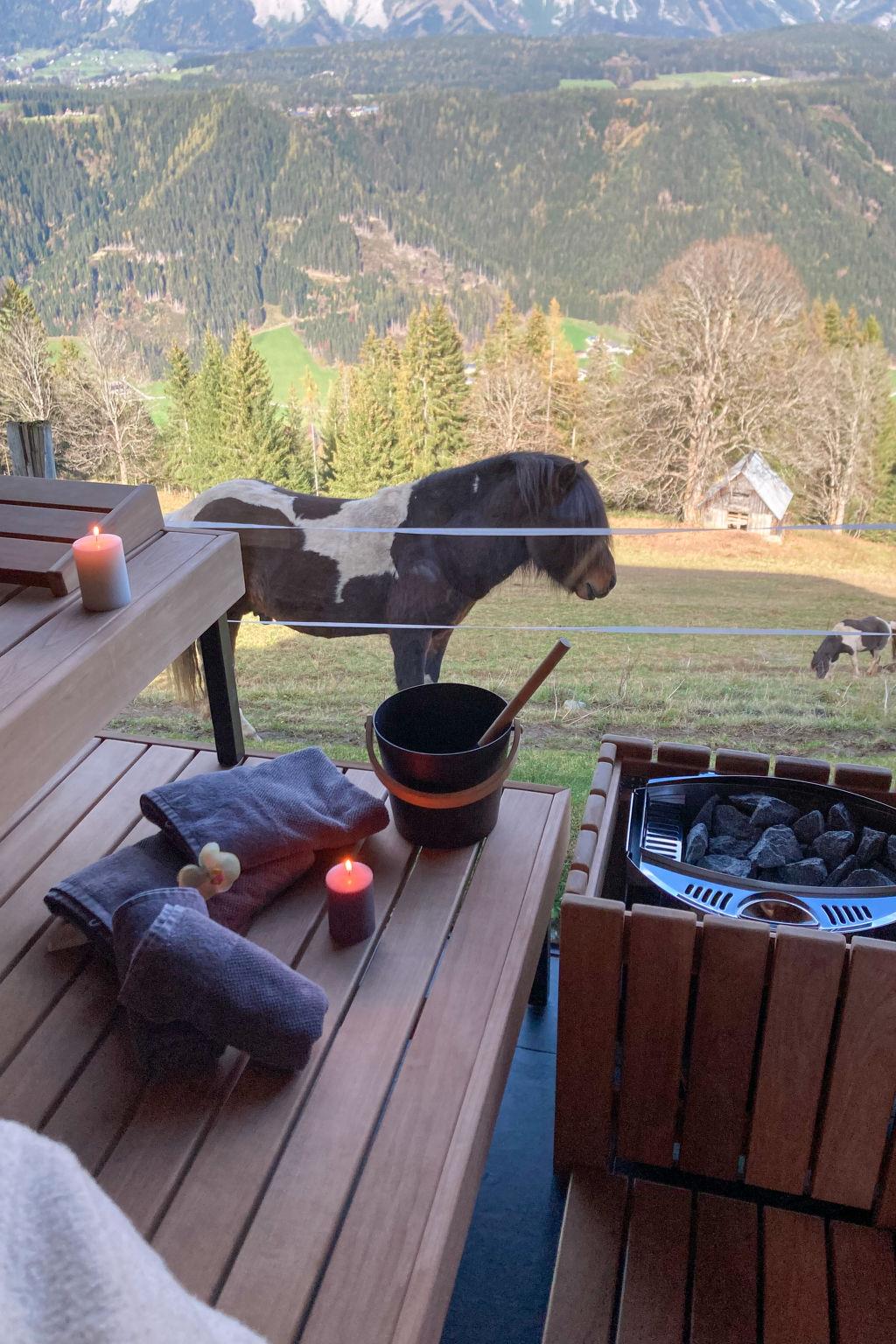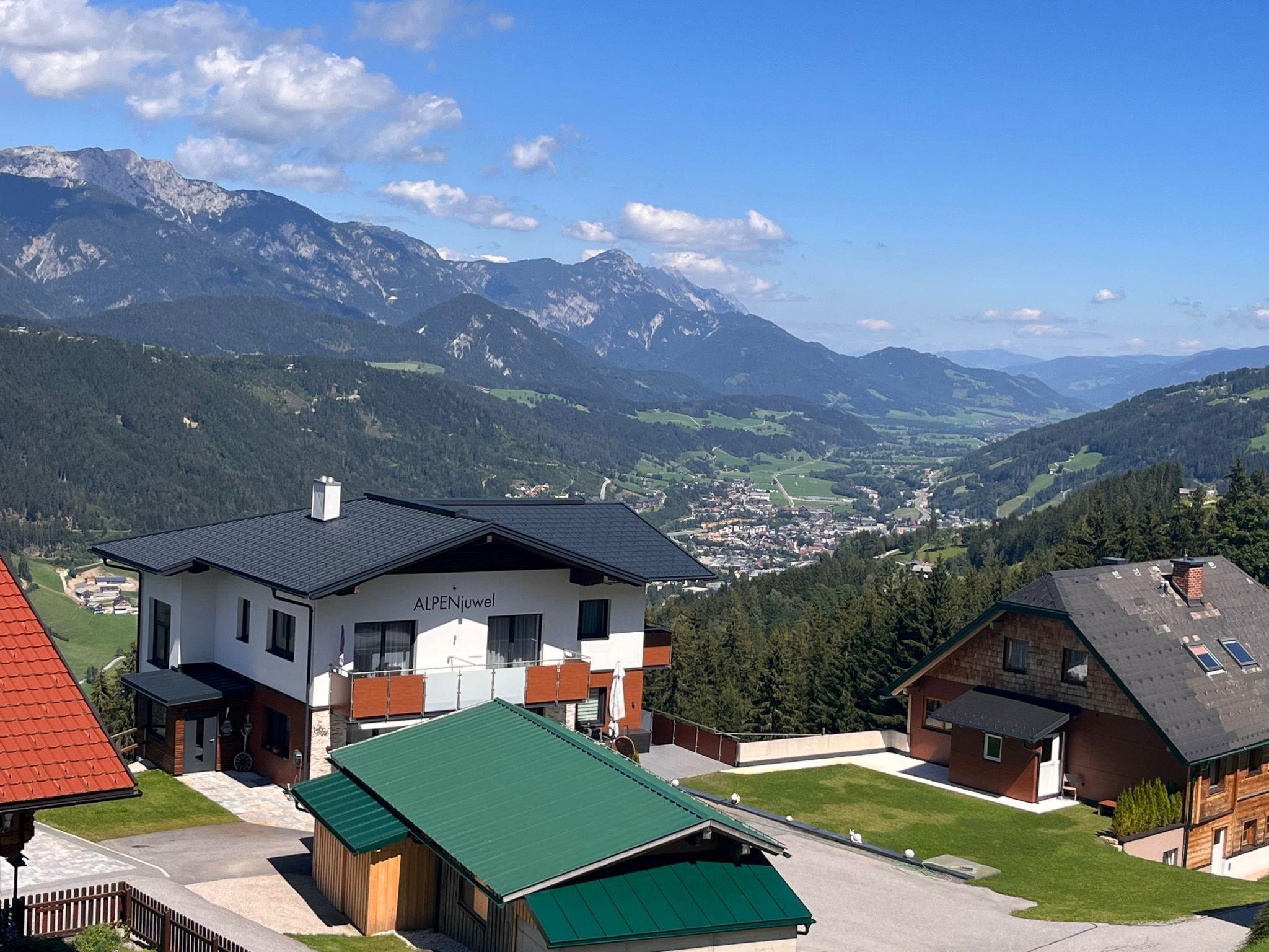 "Rubin", 2-room apartment 50 m2 on 1st floor. Bright, modern and stylish furnishings: living/sleeping room with 1 double sofabed, dining table, dining nook and cable TV. Exit to the balcony. 1 room with 1 double bed. Exit to the balcony. Open kitchen (oven, dishwasher, 4 ceramic glass hob hotplates, toaster, kettle, microwave, freezer, electric coffee machine). Shower/WC. Underfloor heating. Balcony. Balcony furniture. Marvellous panoramic view of the mountains, the valley and Schladming. Facilities: children's high chair, baby cot. Internet (WiFi, free). Parking (1 car) at the house. Please note: non-smoking house. Smoke alarm.