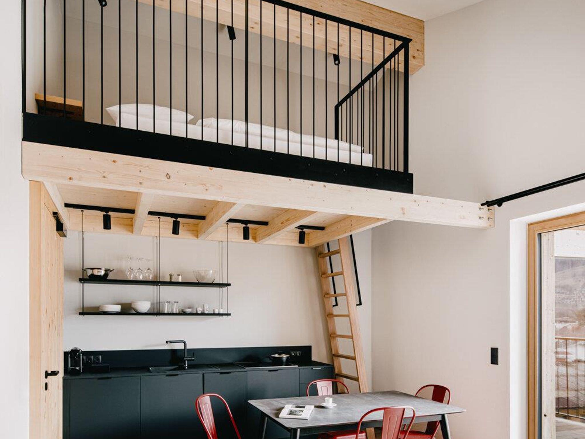 In unserem Penthouse-Studio geht’s hoch her. Und zwar gleich dreifach, denn das 40 Quadratmeter-Studio befindet sich nicht nur im obersten Stockwerk, sondern hat auch eine Raumhöhe von bis zu vier Metern. Und die lädt ja förmlich dazu ein, ein Hochbett für Junge und Junggebliebene einzurichten. Also haben wir es einfach getan.