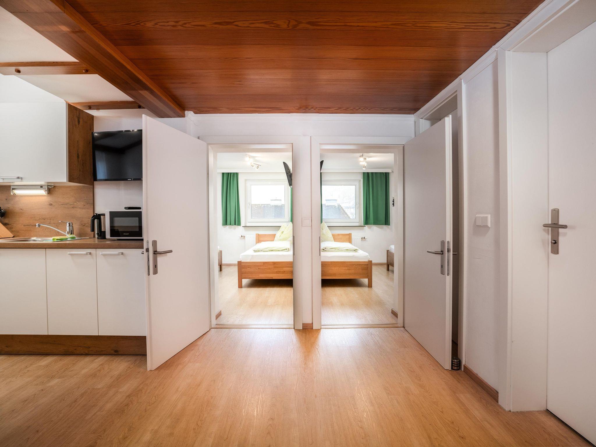 Unsere 6 neu renovierten Apartments befinden sich im 1., 2. und 3. Stockwerk (jeweils zwei Apartments). Das Haus verfügt über einen Lift. Voll ausgestattete Küchen, zwei separate Schlafzimmer sowie ein Badezimmer bieten die Apartments Top 7 bis Top 11. Das Top 12 ist ein Einraumapartment mit Badezimmer und kann mit Top 11 verbunden werden.