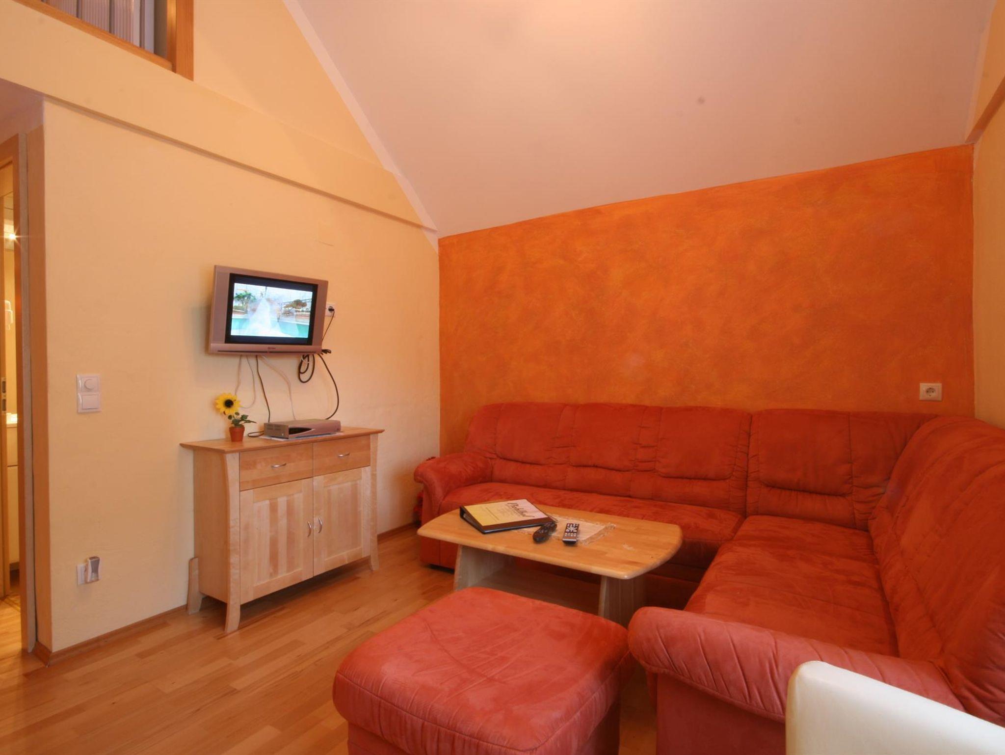 Im Wohnraum finden Sie einen Esstisch mit Eckbank, eine Sitzecke und einen Fernseher mit Sat-TV-Anschluss.