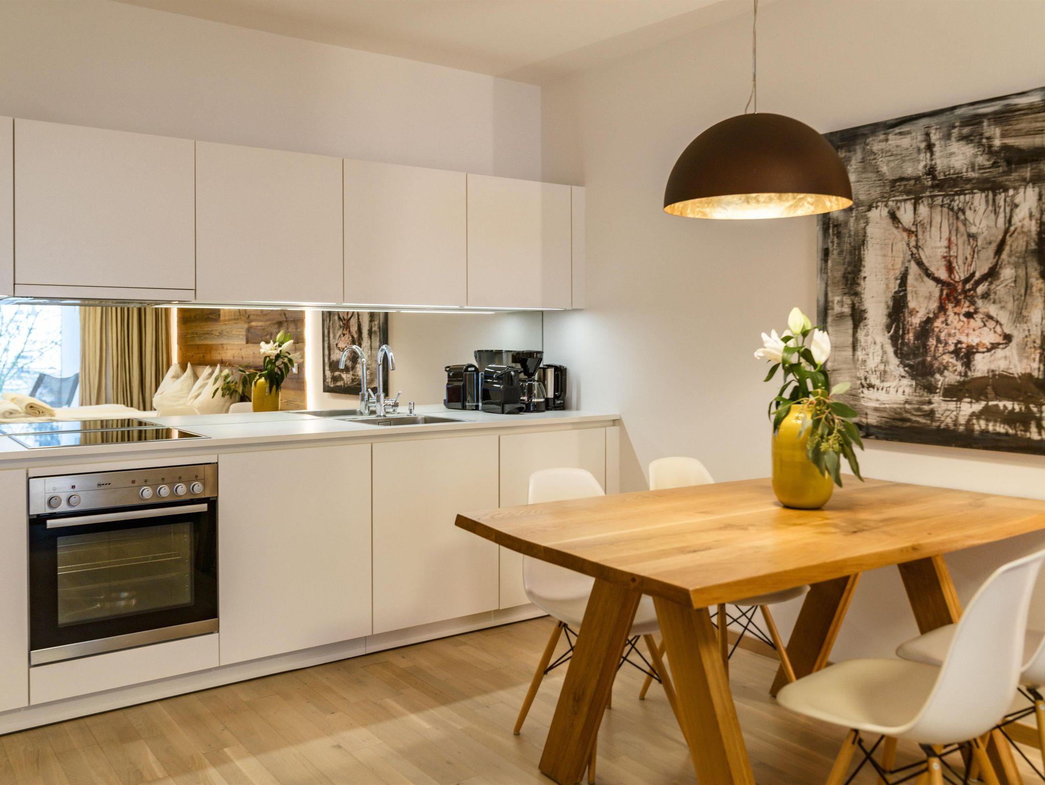 3 miteinander verbunden Häuser 38 servicierte Appartements, von 40m² Studios, Appartements mit einem, zwei oder drei Schlafzimmern bis hin zu 130m² Penthäusern, herrlichen Ausblick und Top Ausstattung inklusive! Die hochwertige Grundausstattung der Appartements mit heimischen Materialen wie Holz, Stein und Glas vermitteln ein modernes Wohlfühlambiente mit viel Licht und Aussicht, - eine Symbiose aus purem Lebensgefühl und Kraftplatz an der Sonne. Komplett ausgestattete Designküchen, großzügige Wohnräume zum Teil mit offenem Kamin, moderne & stylische Möbel, kostenfreies WLAN, Kabel TV in allen Schlaf- und Wohnräumen sowie moderne und lichtdurchflutete Badezimmer, lassen für den Gast, der seine private Freiheit schätzt, keine Wünsche offen .