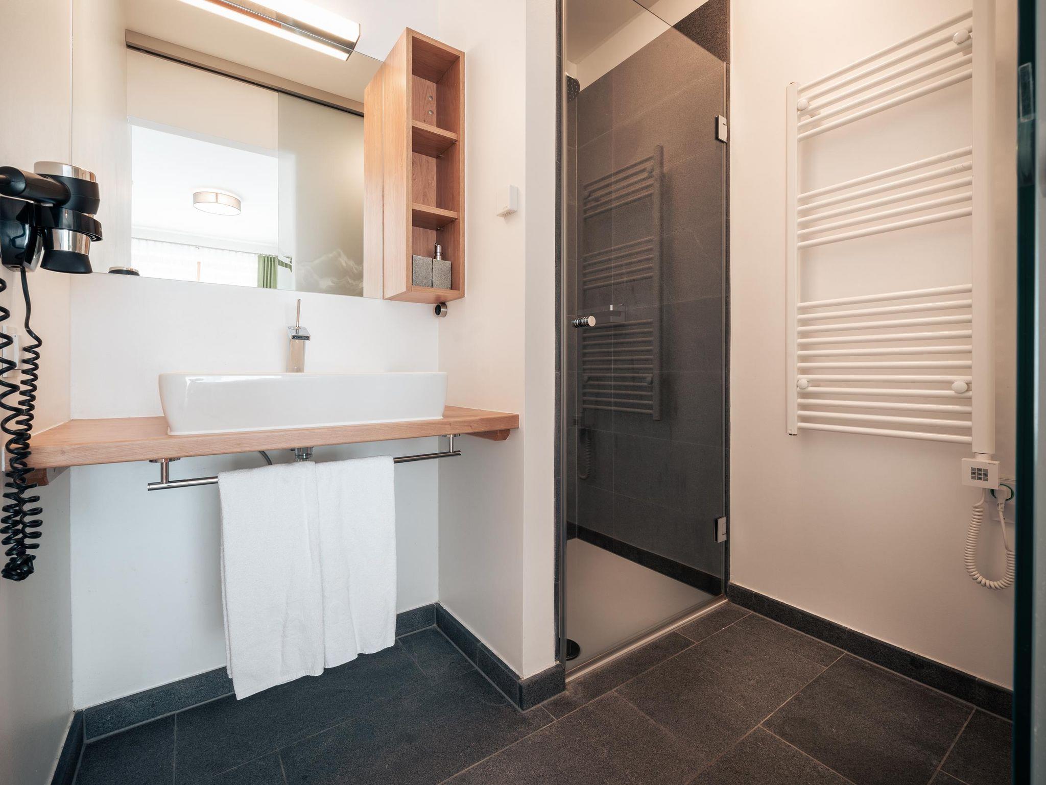 - 1 Badezimmer mit Dusche, Waschmaschine mit Trocknerfunktion, 1 separates WC