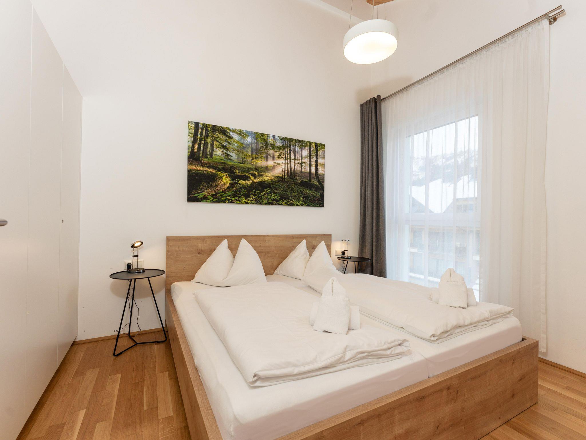 Top 4: 87m² App. im 1. Obergeschoss für 4-6 Personen, großzügiger Wohnraum mit komplett und hochwertig ausgestatteter Küche, Esstisch, Schlafsofa für 2 Personen und TV, 10m² Balkon mit Balkonmöbel und tollem Ausblick auf den Planai Zielhang, zwei separate Schlafzimmer mit Doppelbett, ein en-suite Badezimmer mit Badewanne, Waschtisch sowie ein separates Badezimmer mit Regendusche und Waschtisch, eine separate Toilette ist vorhanden. Skibox mit Skischuhheizung und 1 Tiefgaragenparkplatz.
