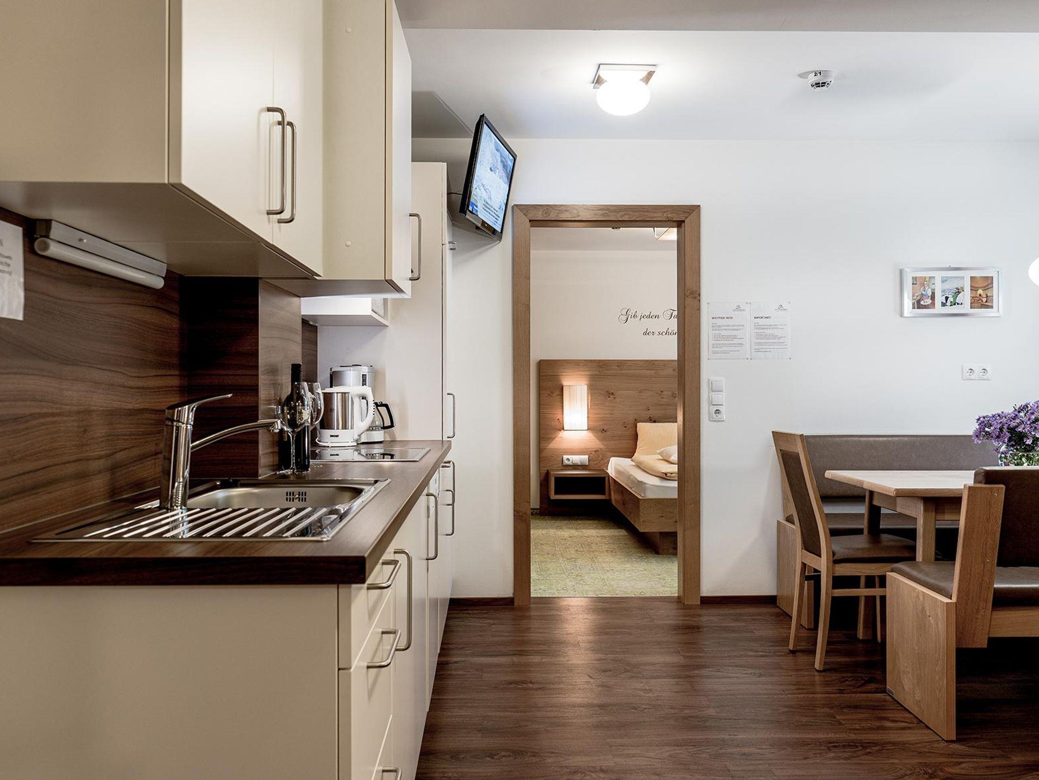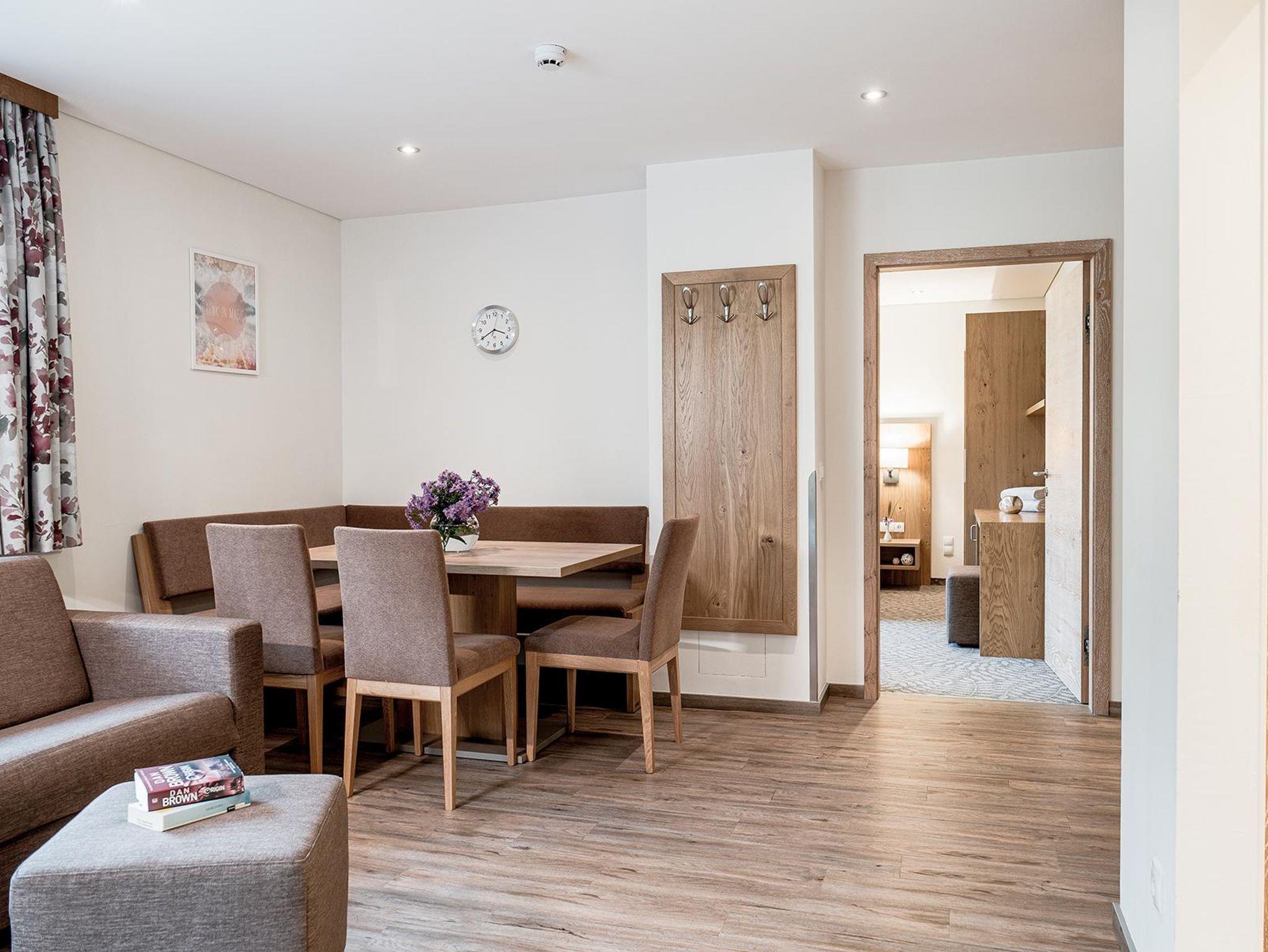 Die vollausgestatteten Appartements und Zimmer sind großzügig gestaltet, warme Farben und viel Holz sorgen für ein angenehmes Wohngefühl. Eine wohltuende Auszeit und Ruhe genießt du im kleinen, aber feinen Wellnessbereich mit Finnischer Sauna, Kräutersauna und Infrarotkabine. Weiteren Komfort bietet die Parkgarage (reservierungs- und kostenpflichtig) mit direktem Zugang zum Appartementgebäude und zum Aufzug sowie ein Ski- und Schuhraum mit beheizten und verschließbaren Skisafes.