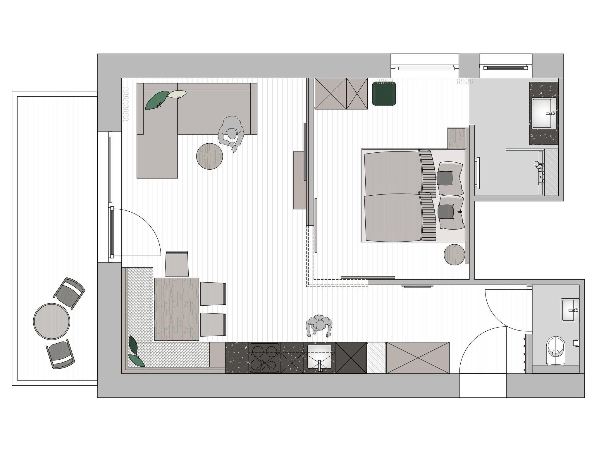 Unsere Studios bieten auf großzügigen 45 m² einen separaten Wohnraum mit Sofa und ein gemütliches Schlafzimmer – ideal für bis zu 4 Personen.