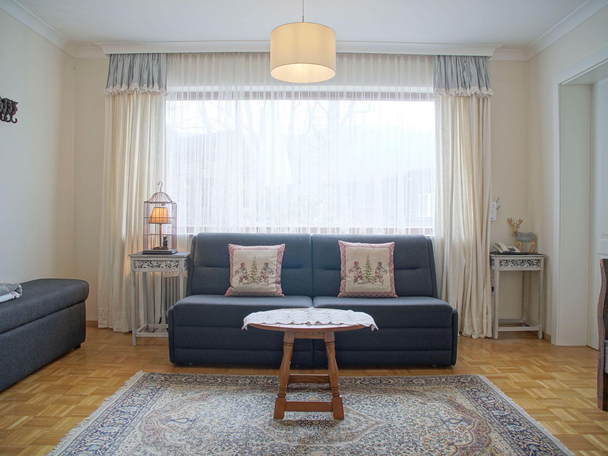 Gemütliches Wohn- und Esszimmer mit Schlafsofa und Kachelofen.