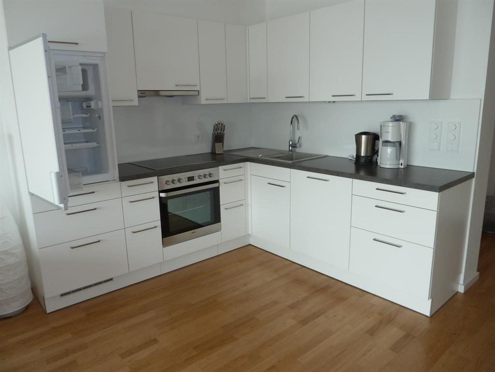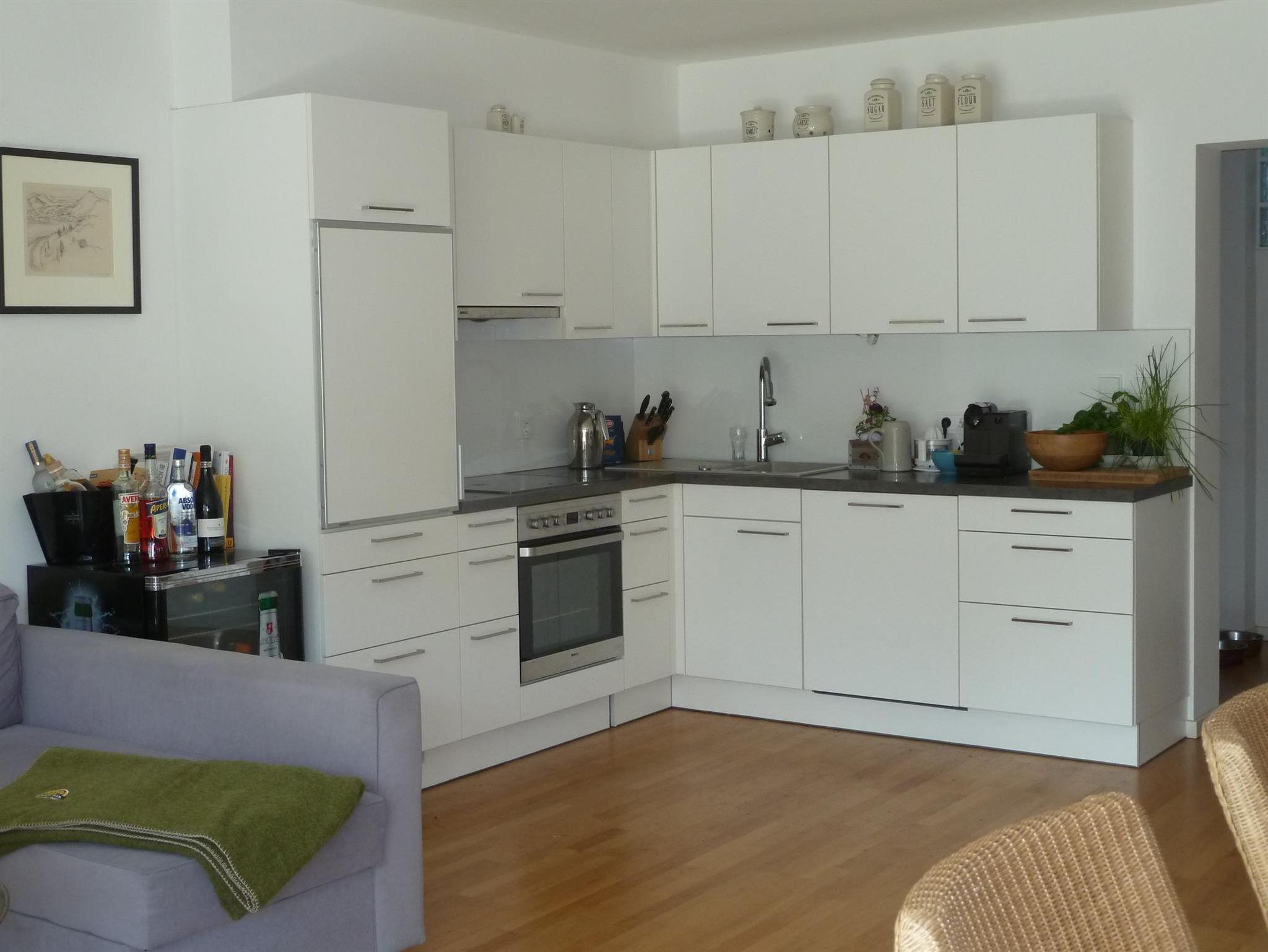 • Küche mit E-Herd, Backofen, Geschirrspüler, Kaffeemaschine und Kühlschrank mit Gefrierfach