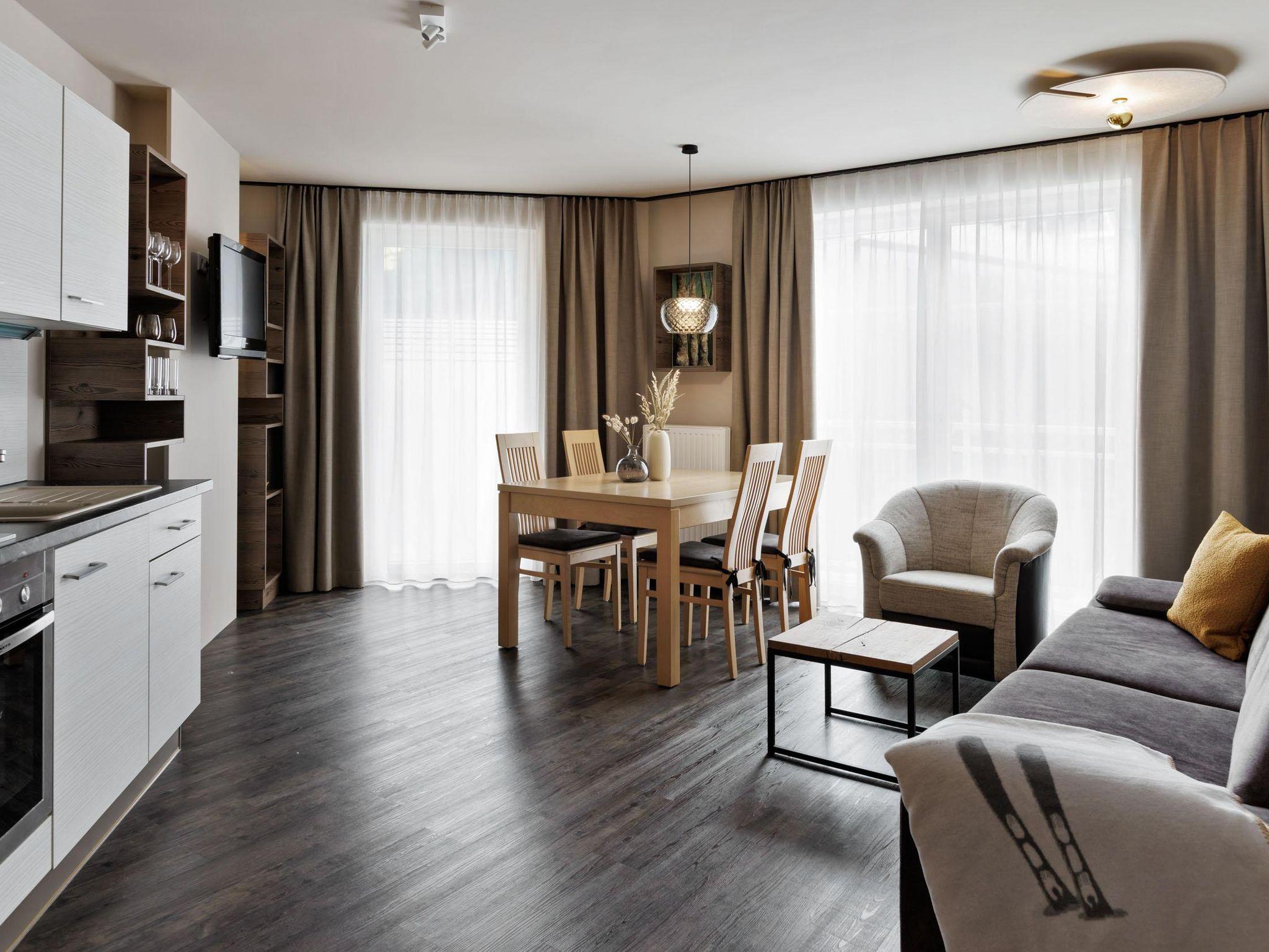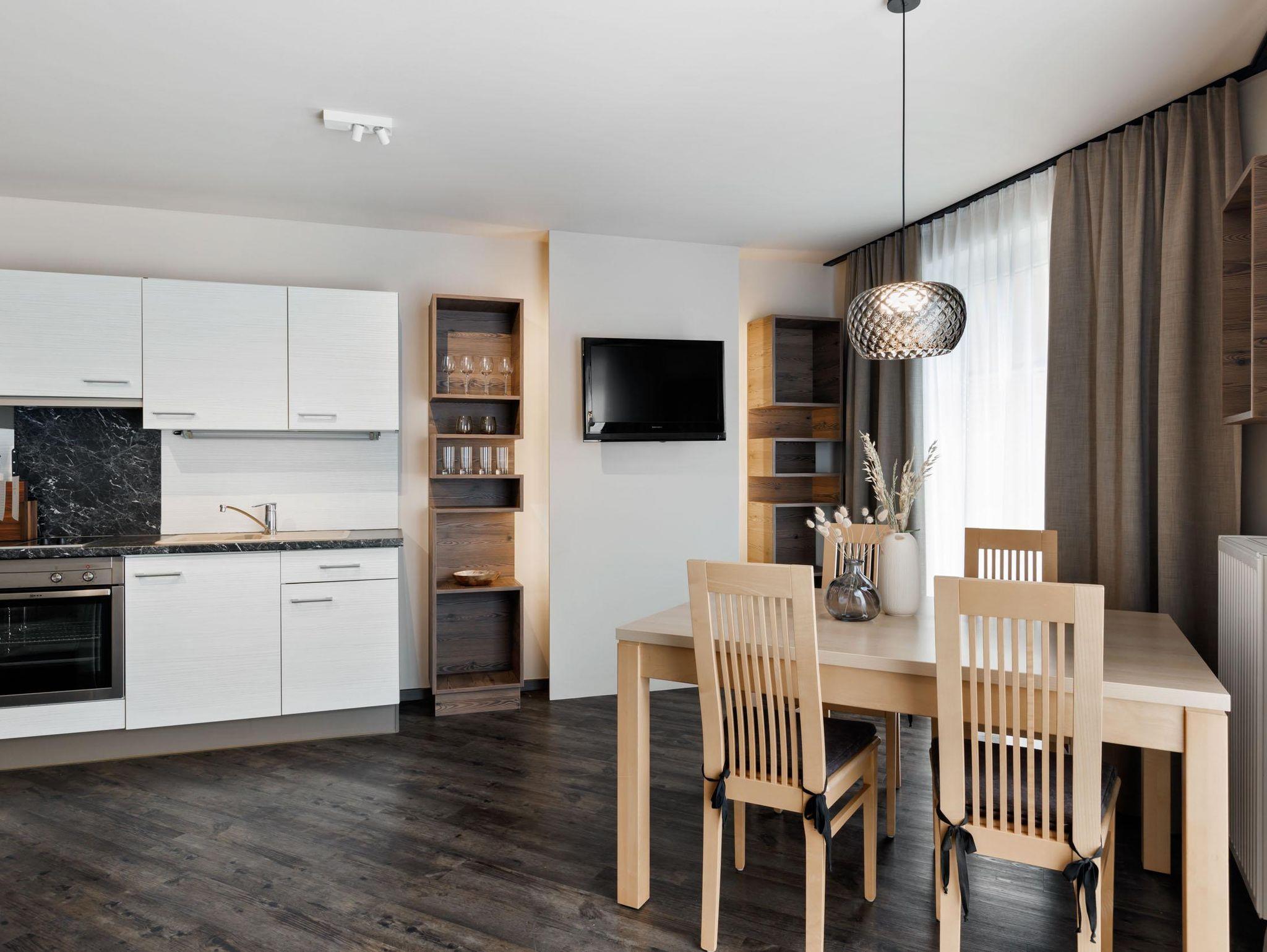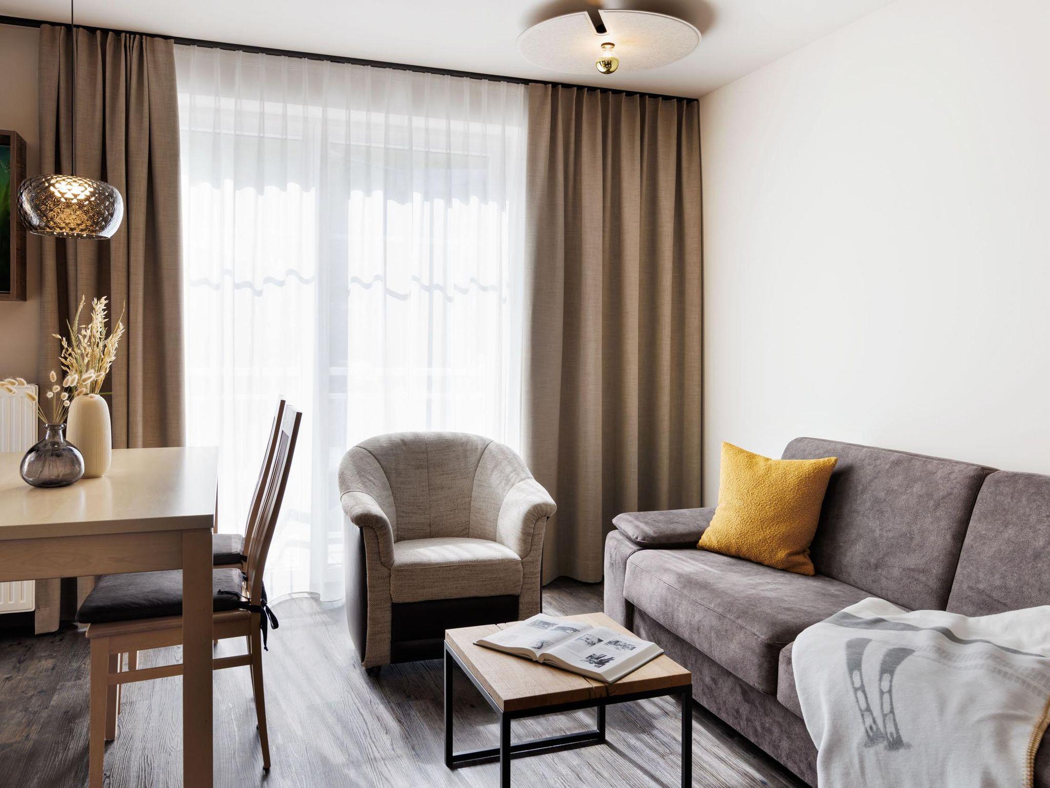 Die Appartements für zwei bis sechs Personen bieten 55 bis 100?m² Wohnfläche mit ein bis zwei Schlafzimmern, geräumigem Wohnbereich mit Schlafsofa (Matratzenfunktion, Größe 170x200), Bad (stets separates WC), WLAN, teils Balkon oder Terrasse und vollausgestatteter Küche. Jede Einheit verfügt außerdem über eine moderne Infrarotkabine. Unser Haus bietet zudem einen Lift.