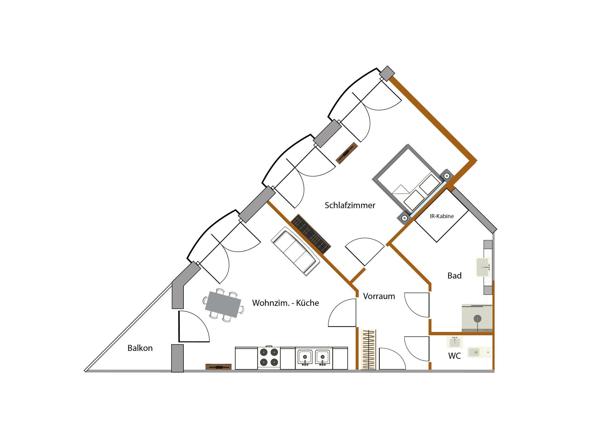 Unsere Ferienwohnung besteht aus 1 Schlafraum mit 2 Betten, welche sowohl als Doppelbett, wie auch als 2 Einzelbetten verwendet werden können. Im Wohnraum befindet sich ein ausziehbares Sofa (Größe 170 x 200 cm). Wohnraum wie auch Schlafraum sind mit einem Flat TV ausgestattet. Die Wohnung verfügt weiters über eine Infrarotkabine, eine Kochgelegenheit, 1 Badezimmer sowie WC und eigenen Balkon.
