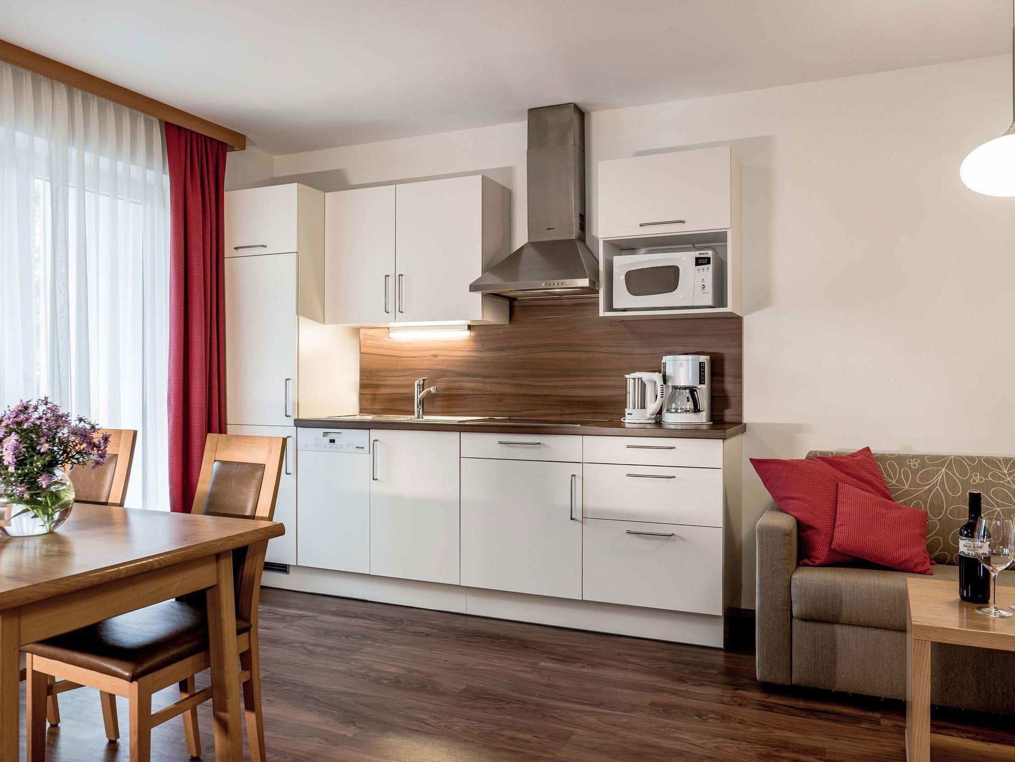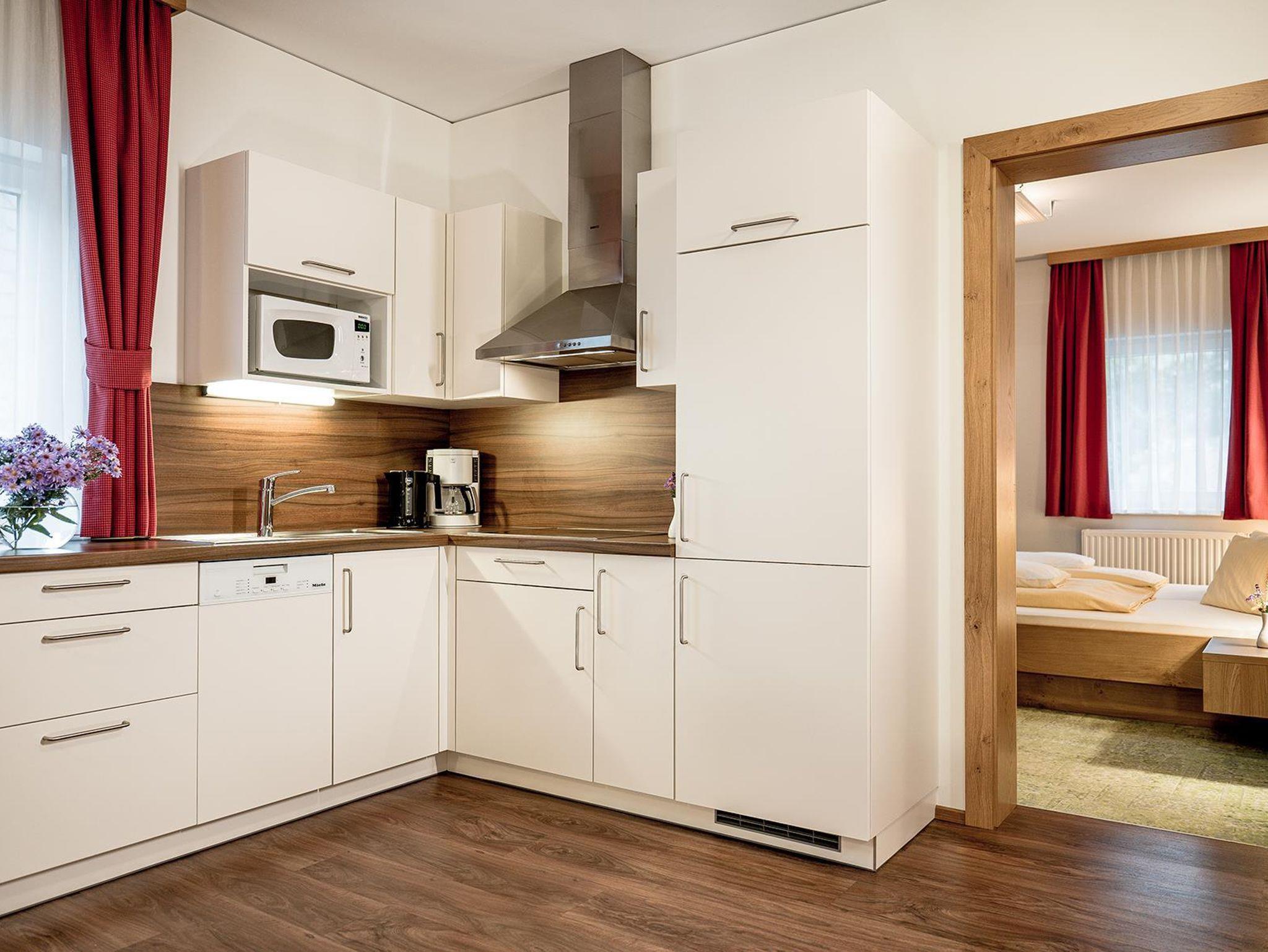 für 4-6 Personen, 50-60 m² Wohnfläche. Das Appartement Superior verfügt über 2 Schlafzimmer mit je einem Doppelbett, teilweise zusätzliche Schlafcouch für 1-2 Personen, 1 Badezimmer mit Dusche und WC, Wohnküche mit Essbereich und vollausgestatteter Küche mit Kühlschrank/Gefrierfach, Mikrowelle, Ceran-Kochfeld, Kaffeemaschine, Geschirrspüler, Kochutensilien und Geschirr. Alle Appartements und Zimmer sind mit Telefon, TV, Safe, Föhn und WLAN Internet ausgestattet.