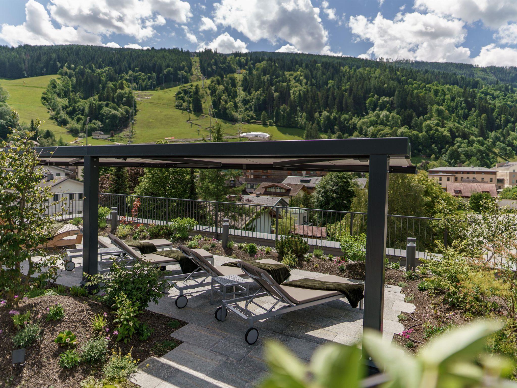 Unser Wellnessbereich Gipfel.Ruhe ist das Highlight. Ob auf der Dachterrasse oder im Ruheraum – der Blick auf Planai und die Tauern ist einfach spektakulär. Hier kannst du loslassen, durchatmen, auftanken.