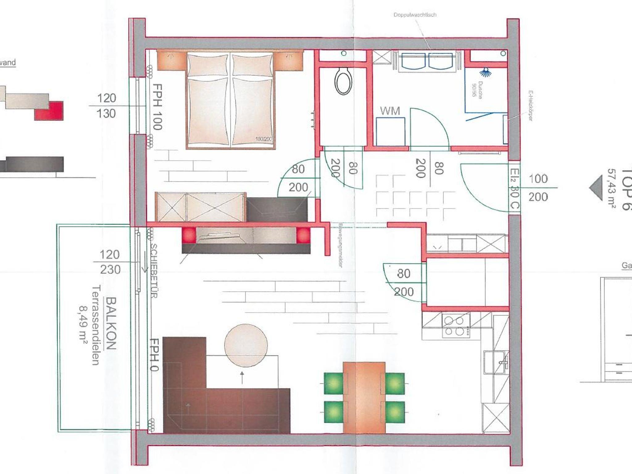 Top 6: 57 m² App. im 1. Obergeschoss für 2-4 Personen, hochwertige, voll ausgestattete Wohnküche mit Esstisch, Schlafsofa für 2 Personen und TV, 9 m² Balkon mit Balkonmöbel, ein separates Schlafzimmer mit Doppelbett und TV, ein Badezimmer mit Doppelwaschtisch, Dusche, eine separate Toilette, 1x Tiefgaragenparkplatz.
