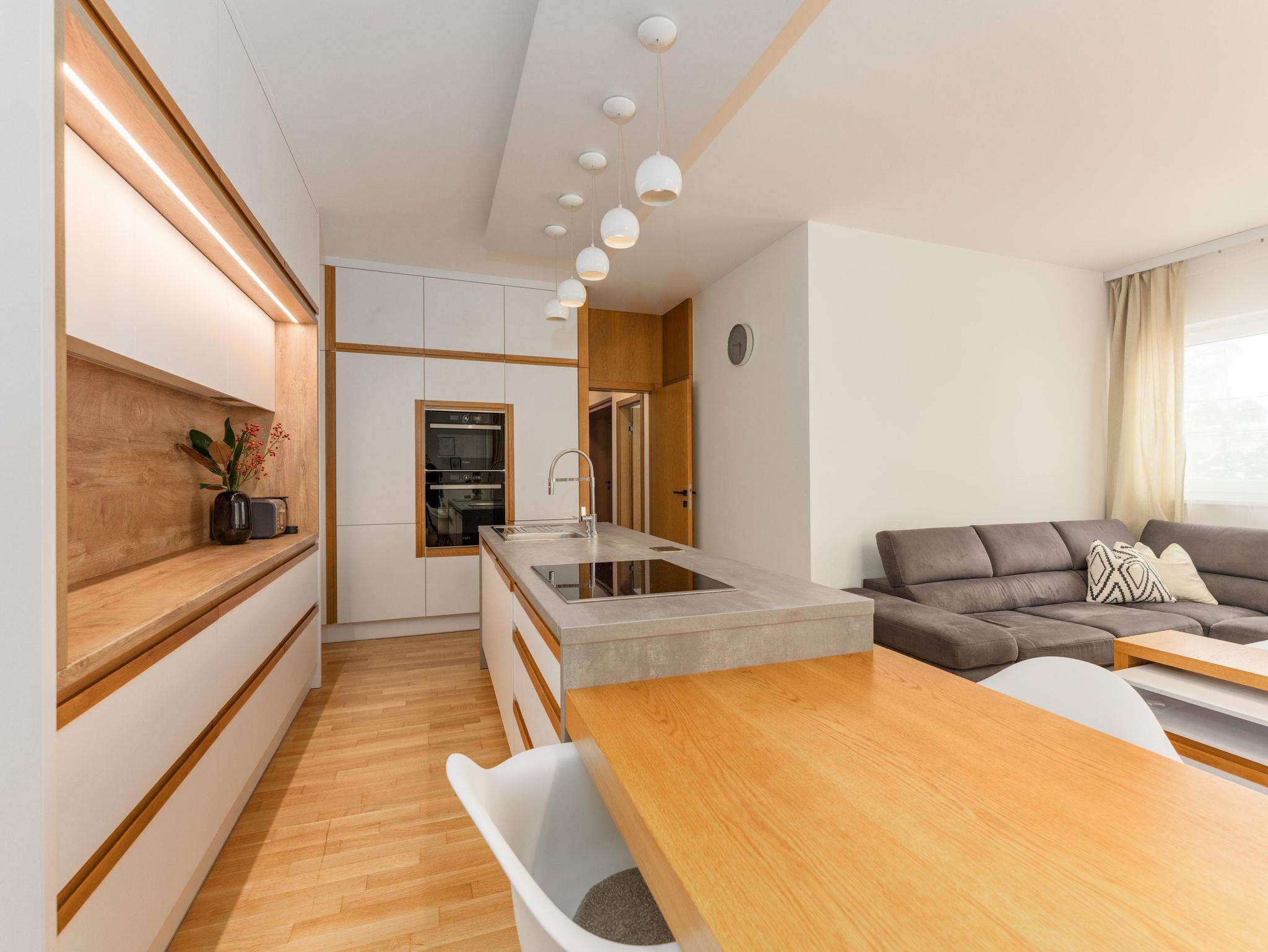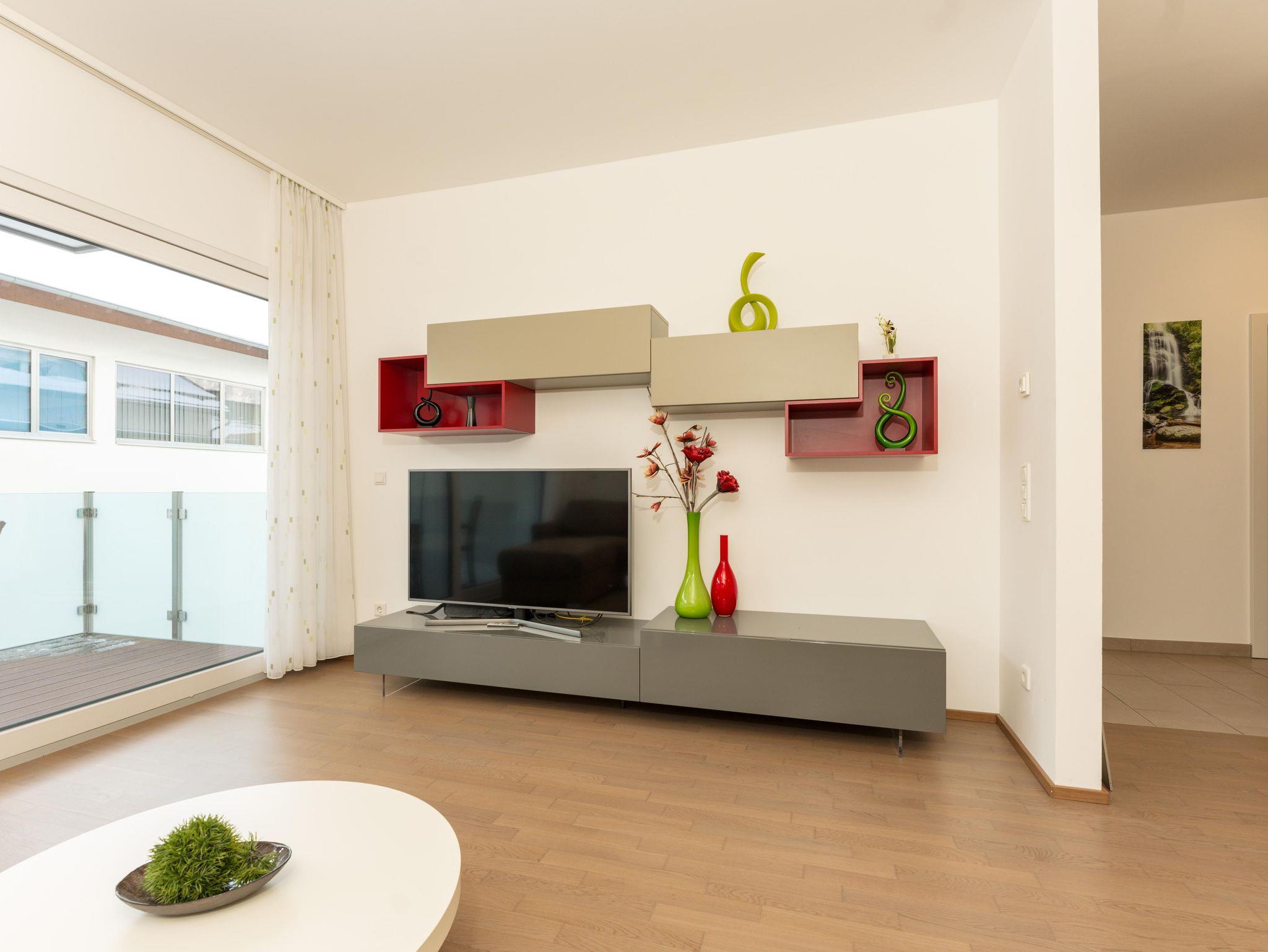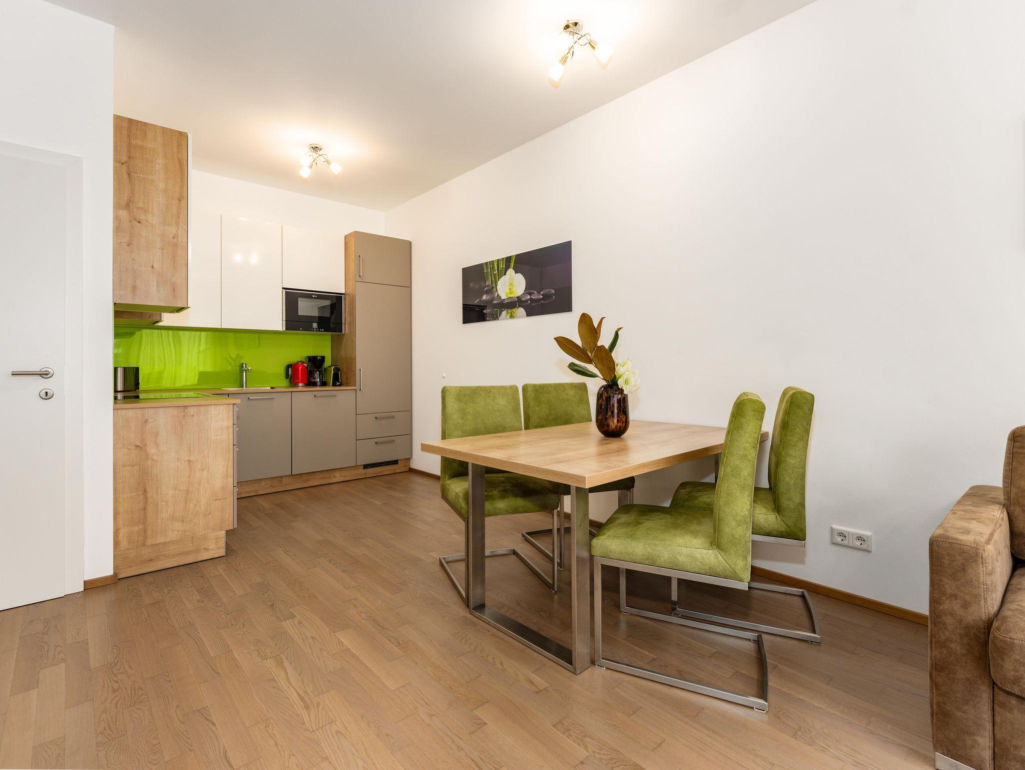 Top 2: 60 m² App. im Erdgeschoss für 2-4 Personen, voll ausgestattete Wohnküche mit Esstisch, Schlafsofa für 2 Personen und TV, 40 m² Terrasse mit Lounge- und Gartenmöbel, ein separates Schlafzimmer mit Doppelbett und TV, ein Badezimmer mit Dusche, eine separate Toilette, 1x Tiefgaragenparkplatz.