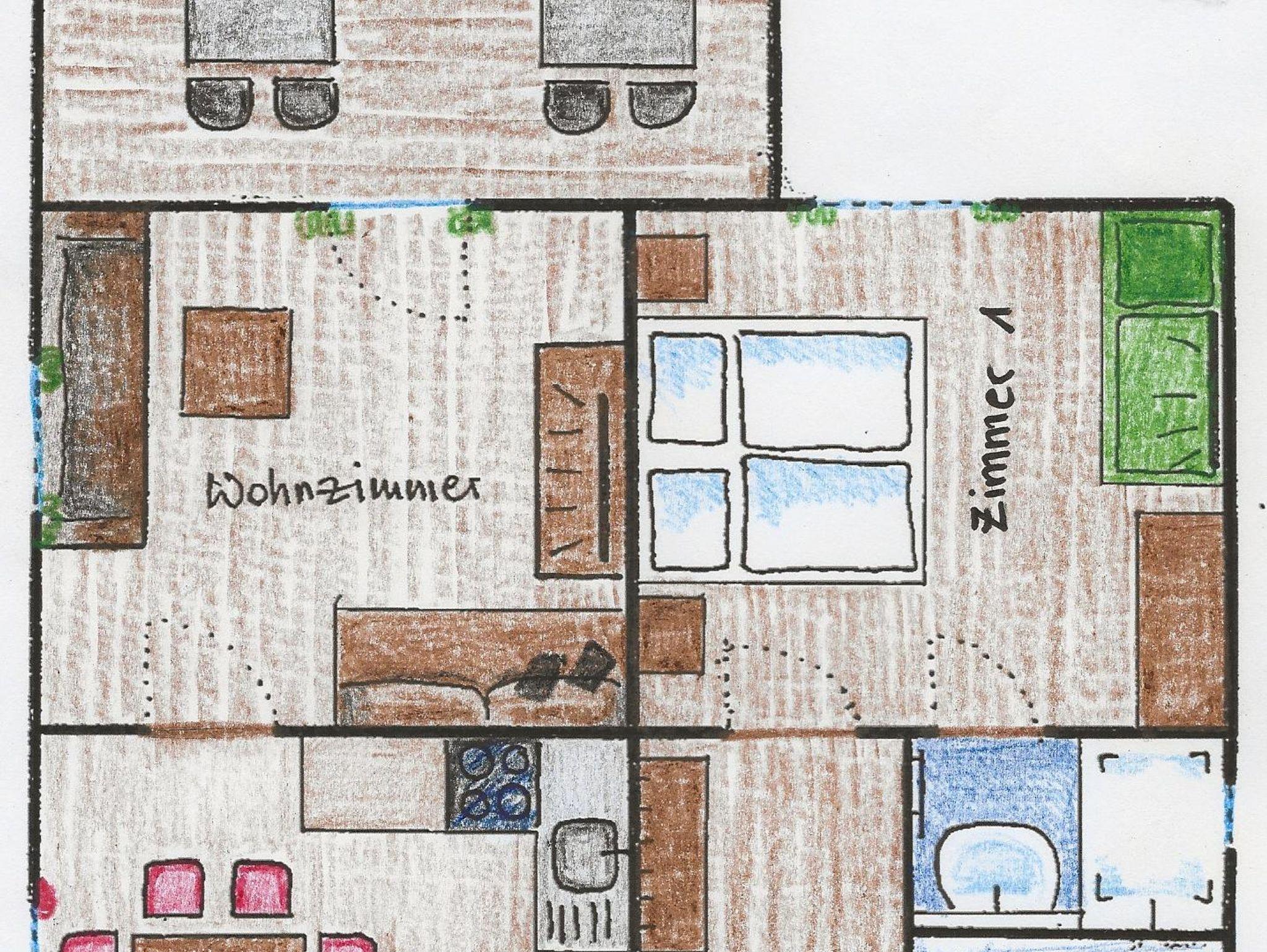 Obergeschoss: 1 Schlafzimmer mit Doppelbett, Einzelbett, TV, Balkon und Bad mit Dusche/WC (Osten), 1 Schlafzimmer mit Doppelbett, TV, Bad mit Dusche/WC und Balkon (Osten), 1 Schlafzimmer mit Doppelbett, TV, Bad mit Dusche/WC und Balkon (Westen)