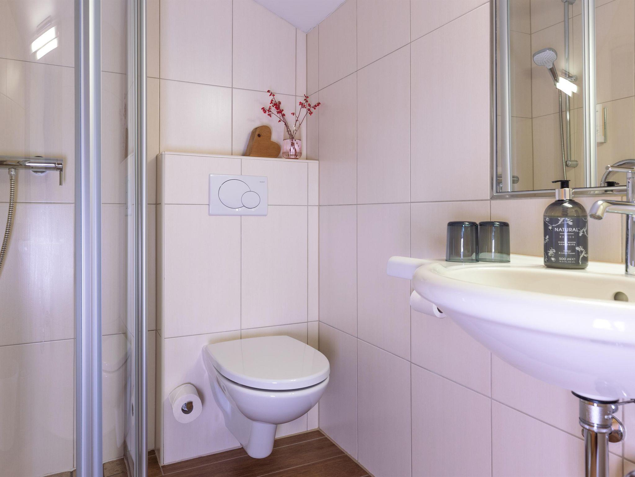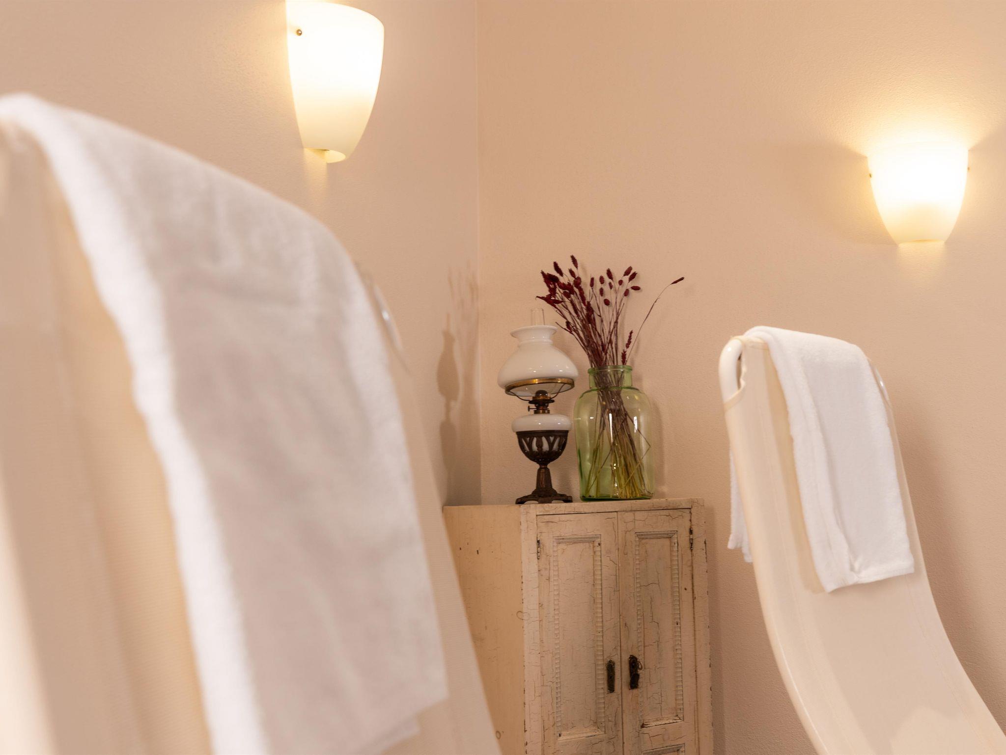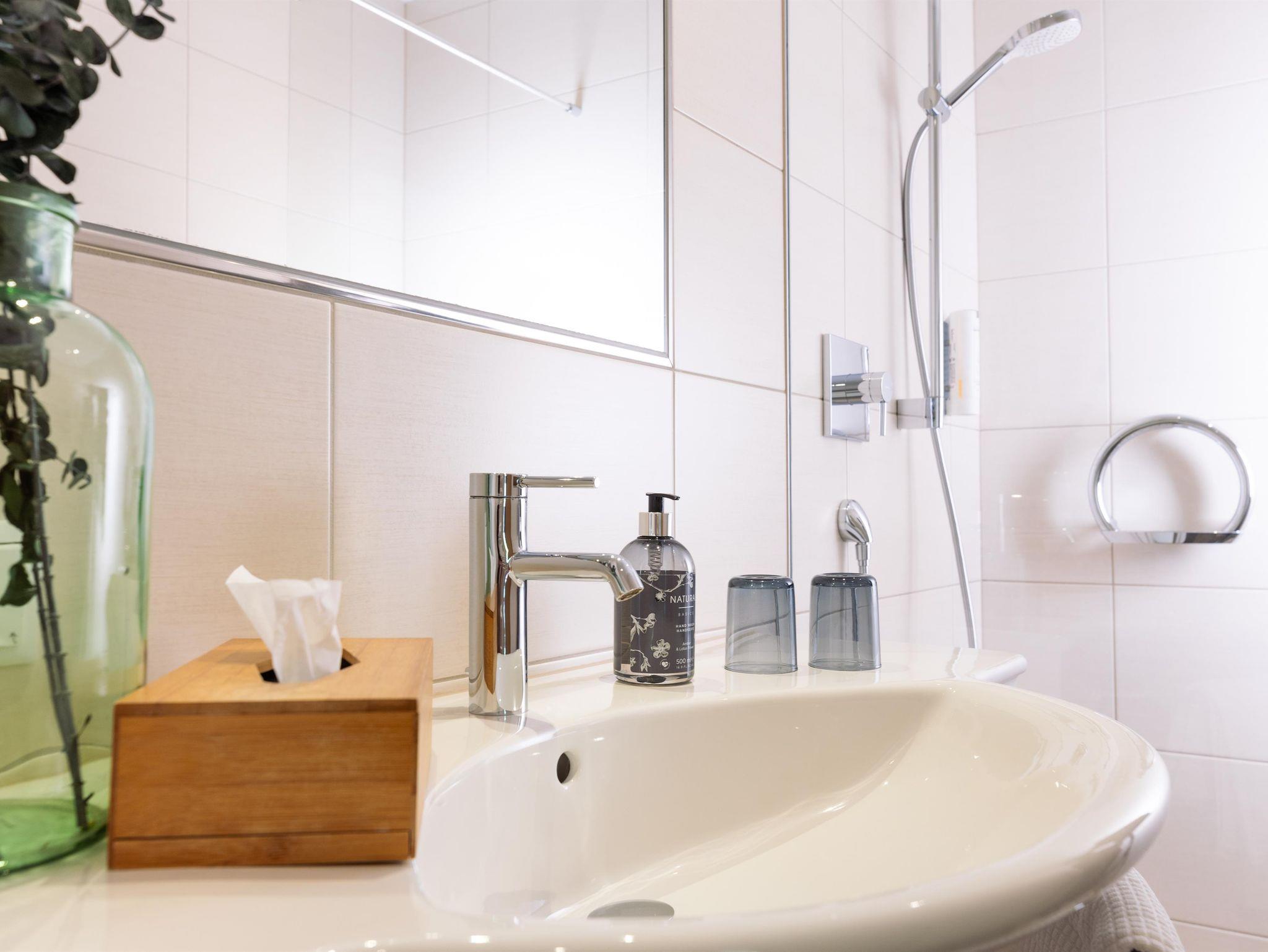 Die Bäder wurden mit Fliesen in Holzoptik und Marmor aus der Region gestaltet und das Sofa aus typischen Schladminger Loden verleiht dem Zimmer eine gemütliche Atmosphäre.