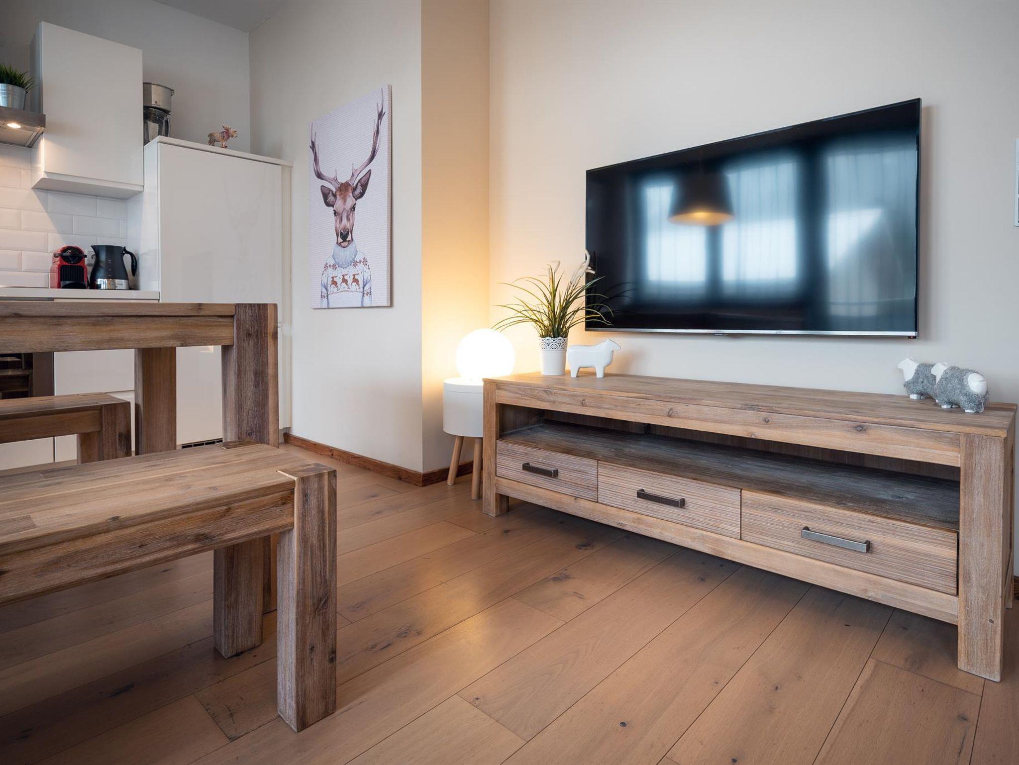- Großzügiger Wohnraum mit komplett ausgestatteter Küche (4-Platten Elektroherd, Geschirrspüler, Backofen, Kühlschrank + Gefrierfach, Nespresso Tabs-Kaffeemaschine und Filter-Kaffeemaschine, Wasserkocher, Toaster, Dunstabzug, Kombi-Mikrowelle), Esstisch, Sofa (auch als Schlafsofa für 2 Personen umfunktionierbar) und TV