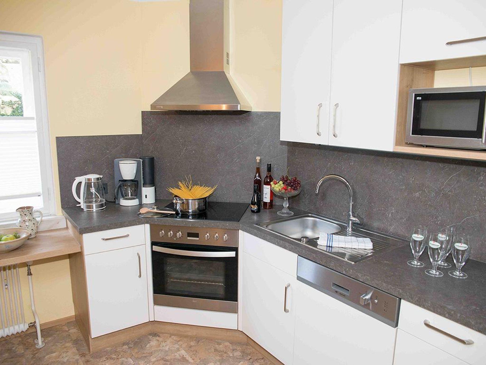• KÜCHE mit Essbereich, E-Herd, Mikrowelle, Kaffeemaschine, Wasserkocher, Toaster, Geschirr, Gläser, Besteck, Kochtöpfe, Geschirrspüler, Kühl-Gefrierschrank, Gewürze … es ist einfach alles da!