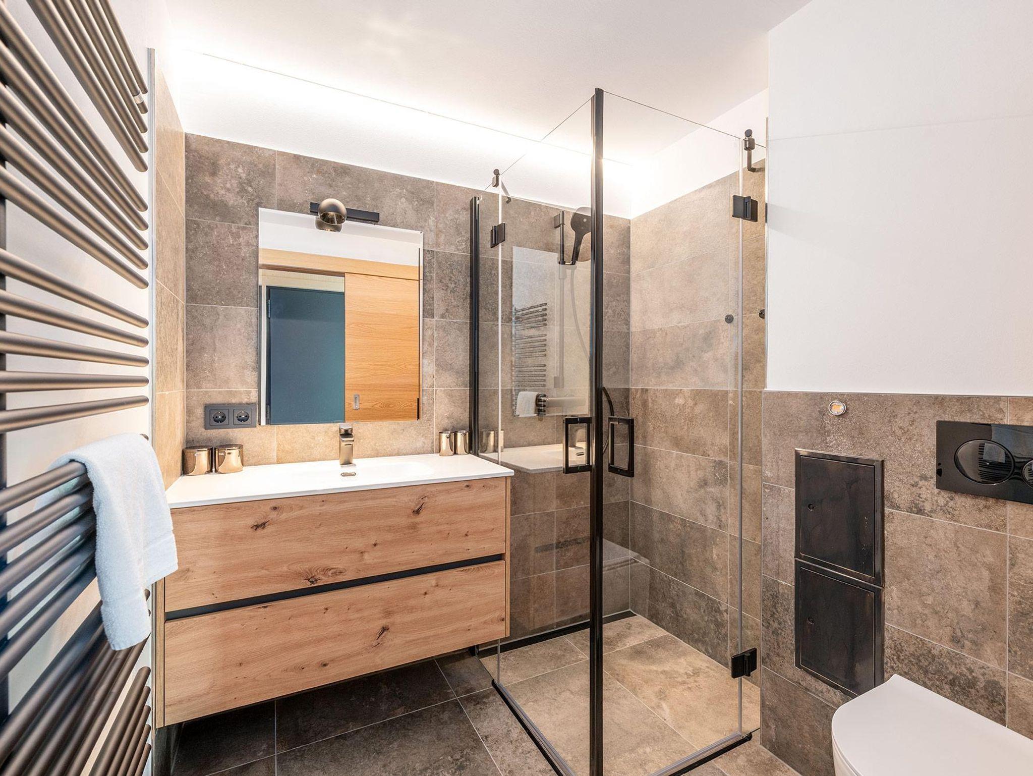 Das moderne Badezimmer mit Dusche überzeugt durch stilvolles Design und hochwertige Ausstattung. Große Fensterflächen lassen viel Tageslicht herein und verbinden den Innenraum mit dem historischen Stadtbild Schladmings.