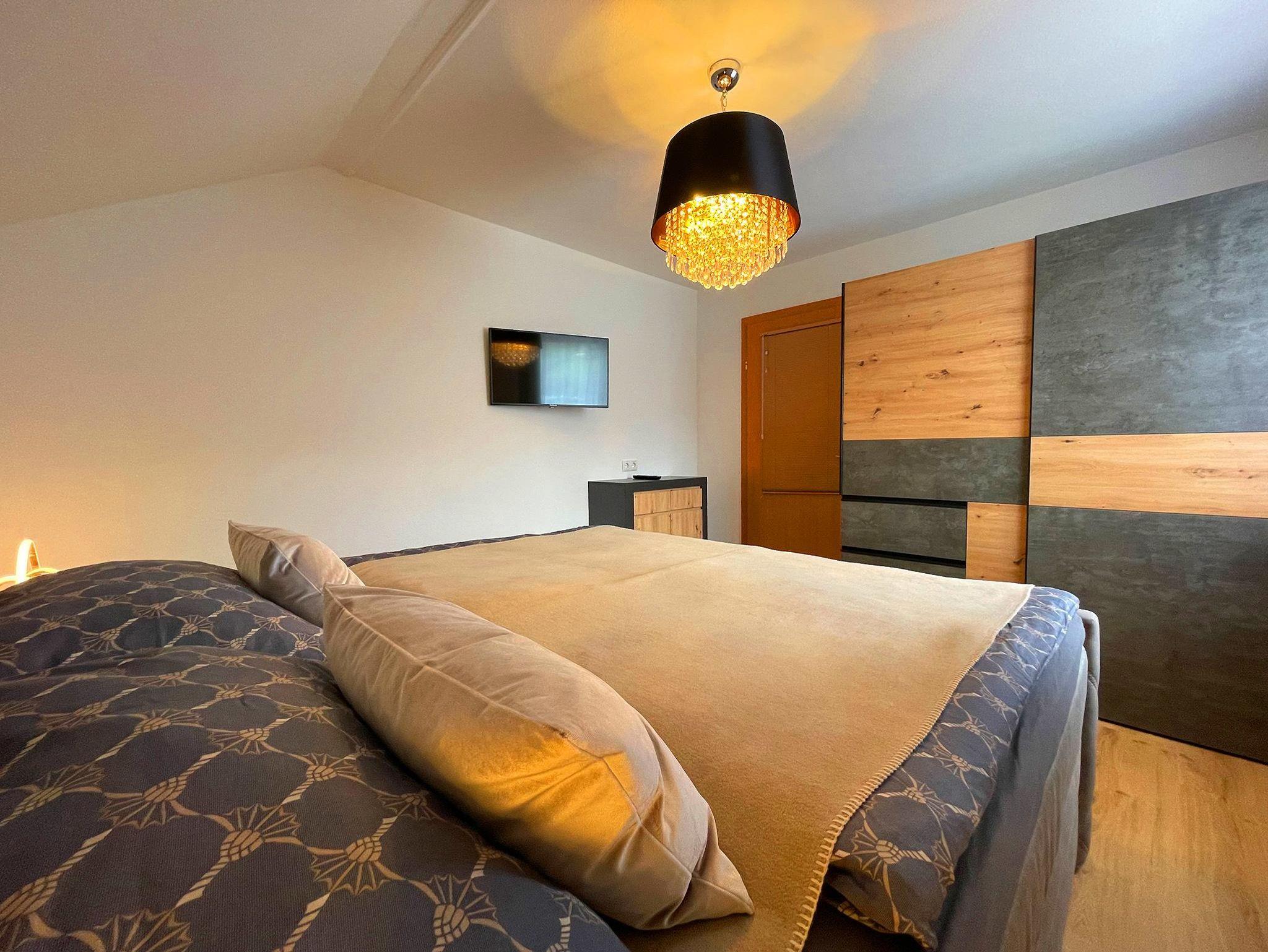Das Apartment verfügt über 2 Schlafzimmer mit je einem großen Boxspringbett sowie Schwebetürenschränke, Boards und TV Geräten.