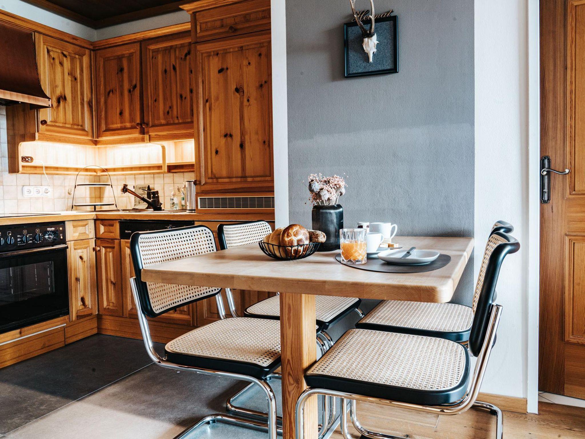Der weitläufige Wohnbereich ist mit einer modernen, voll ausgestatteten Küche versehen, die alle Bedürfnisse erfüllt. Ganz gleich, ob Du nur ein schnelles Frühstück zubereiten oder ein ausgiebiges Abendessen kochen möchtest – sämtliche Geräte und Küchenutensilien (inklusive Backofen) stehen bereit. Der angrenzende Essbereich ist der ideale Ort, um gemeinsam mit Familie oder Freunden zu speisen.