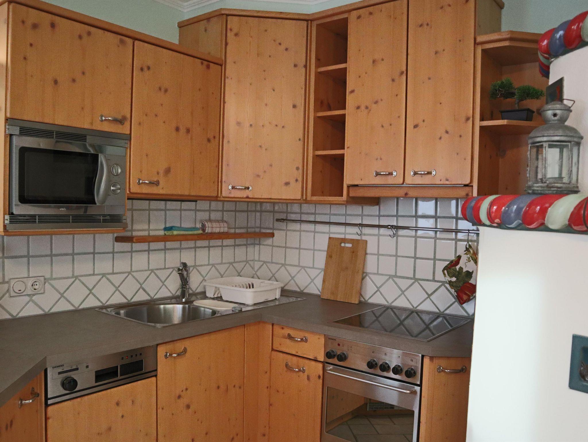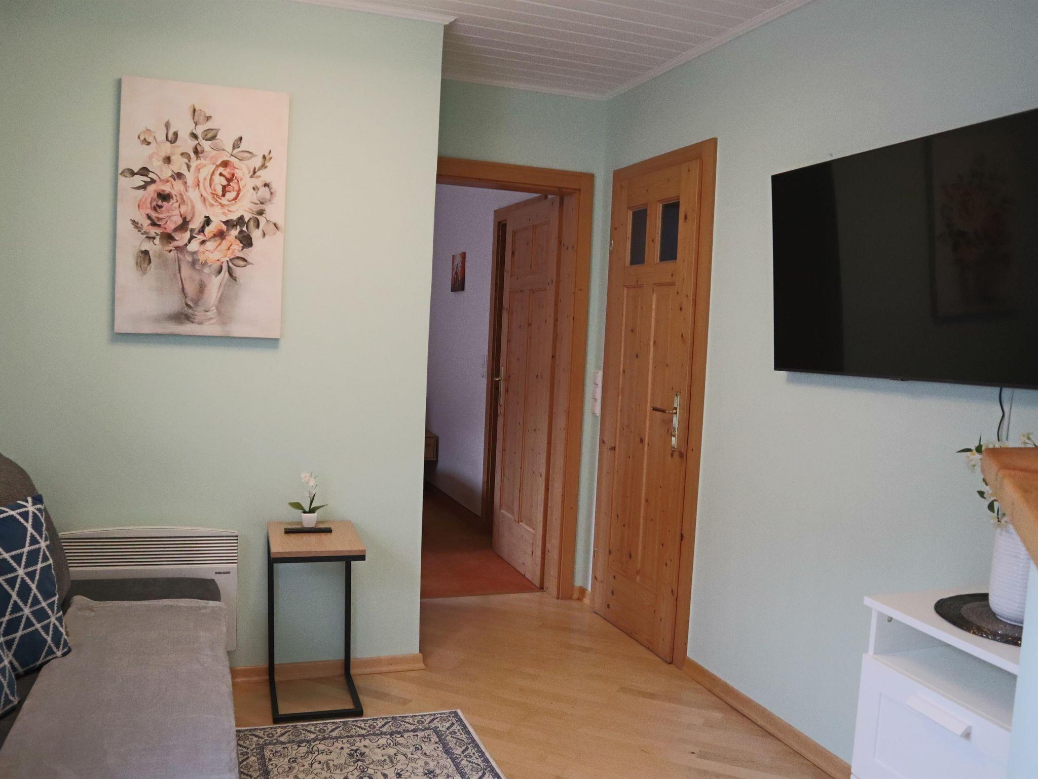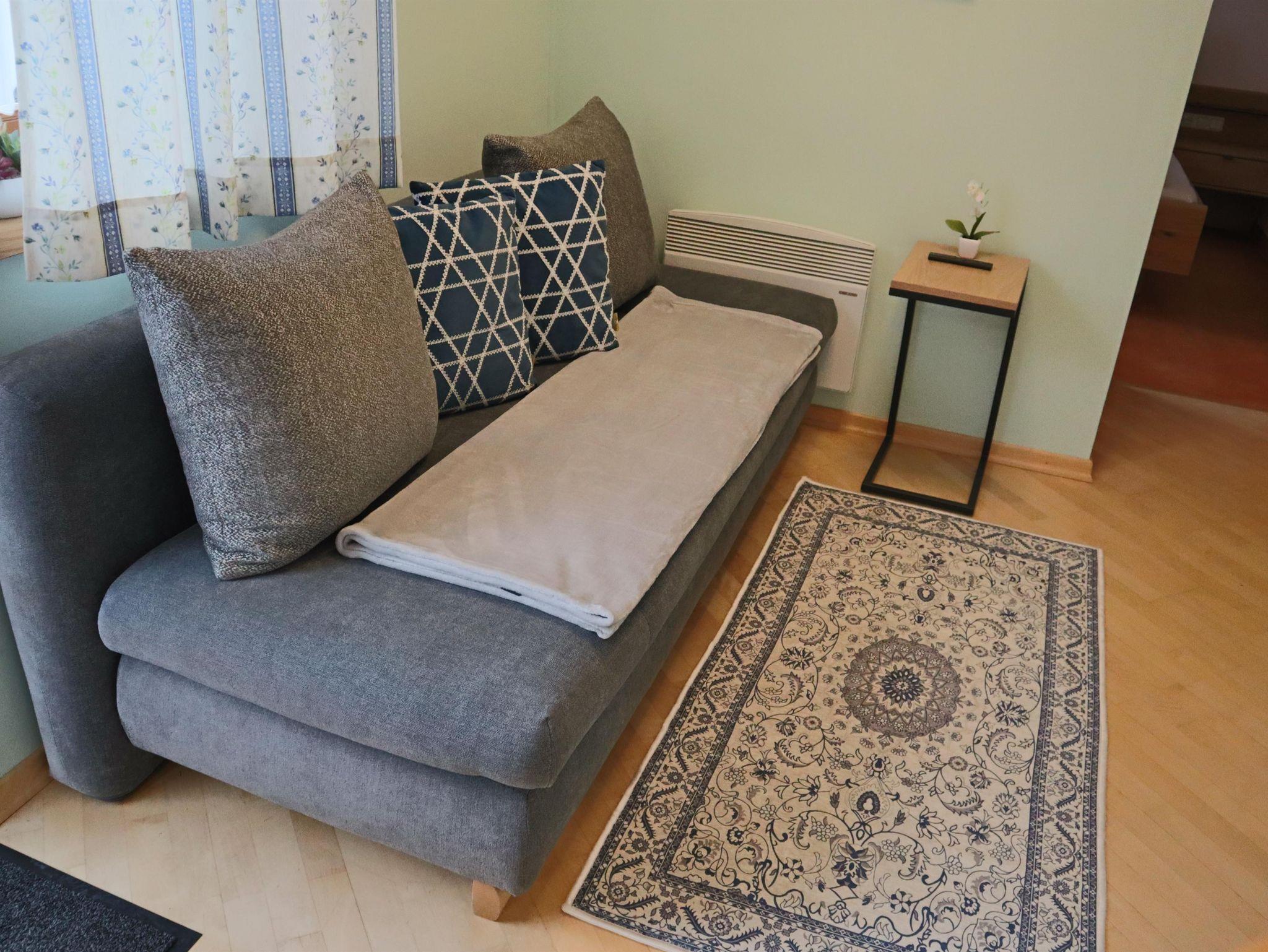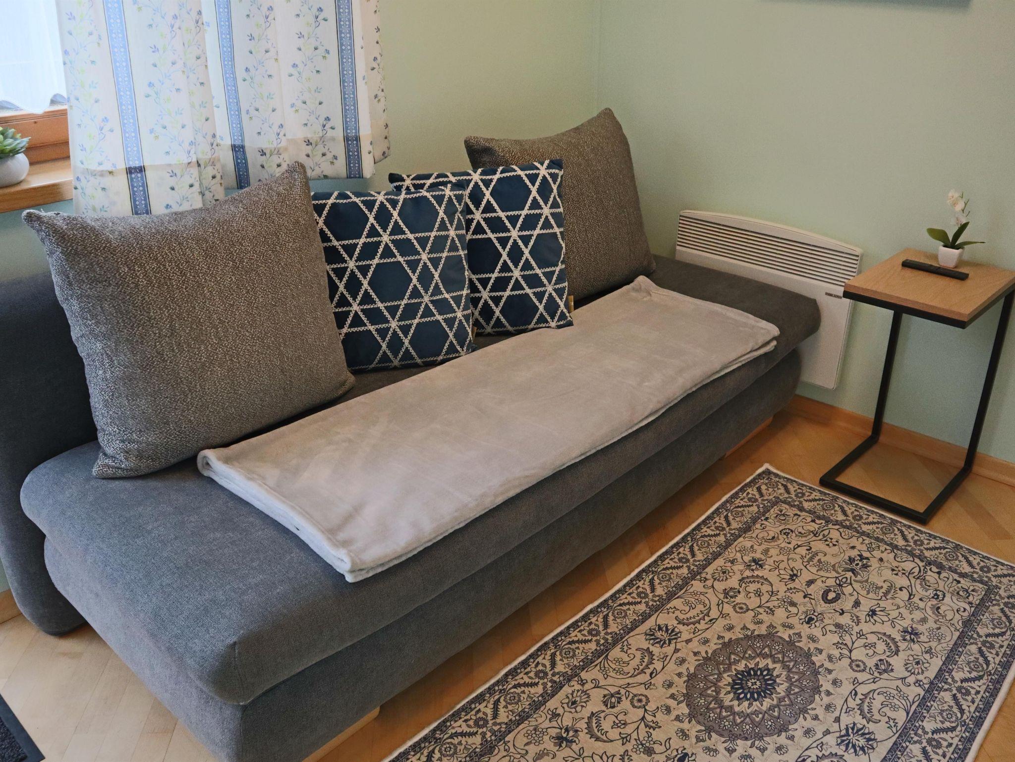 Außerdem gibt es einen Eckbank mit 2 Stühlen, eine ausziehbare Couch (max. 2 Personen) und einen Fernseher in der Wohnküche. Die Wohneinheit bietet auch einen Zugang zum Balkon. Das Appartement hat auch 1 Badezimmer mit Dusche, wo auch ein Haarföhn zur Verfügung steht und eine Toilette.