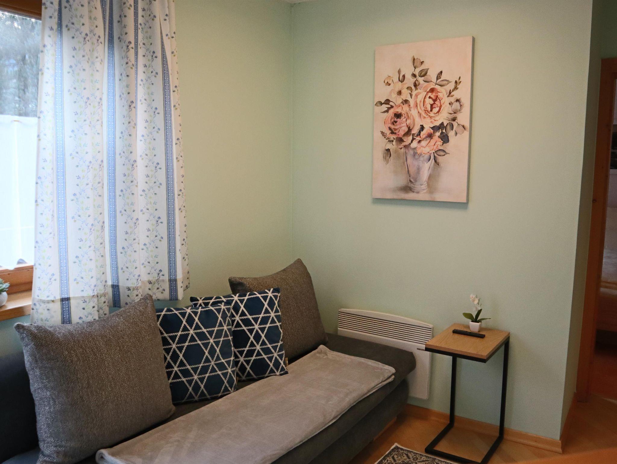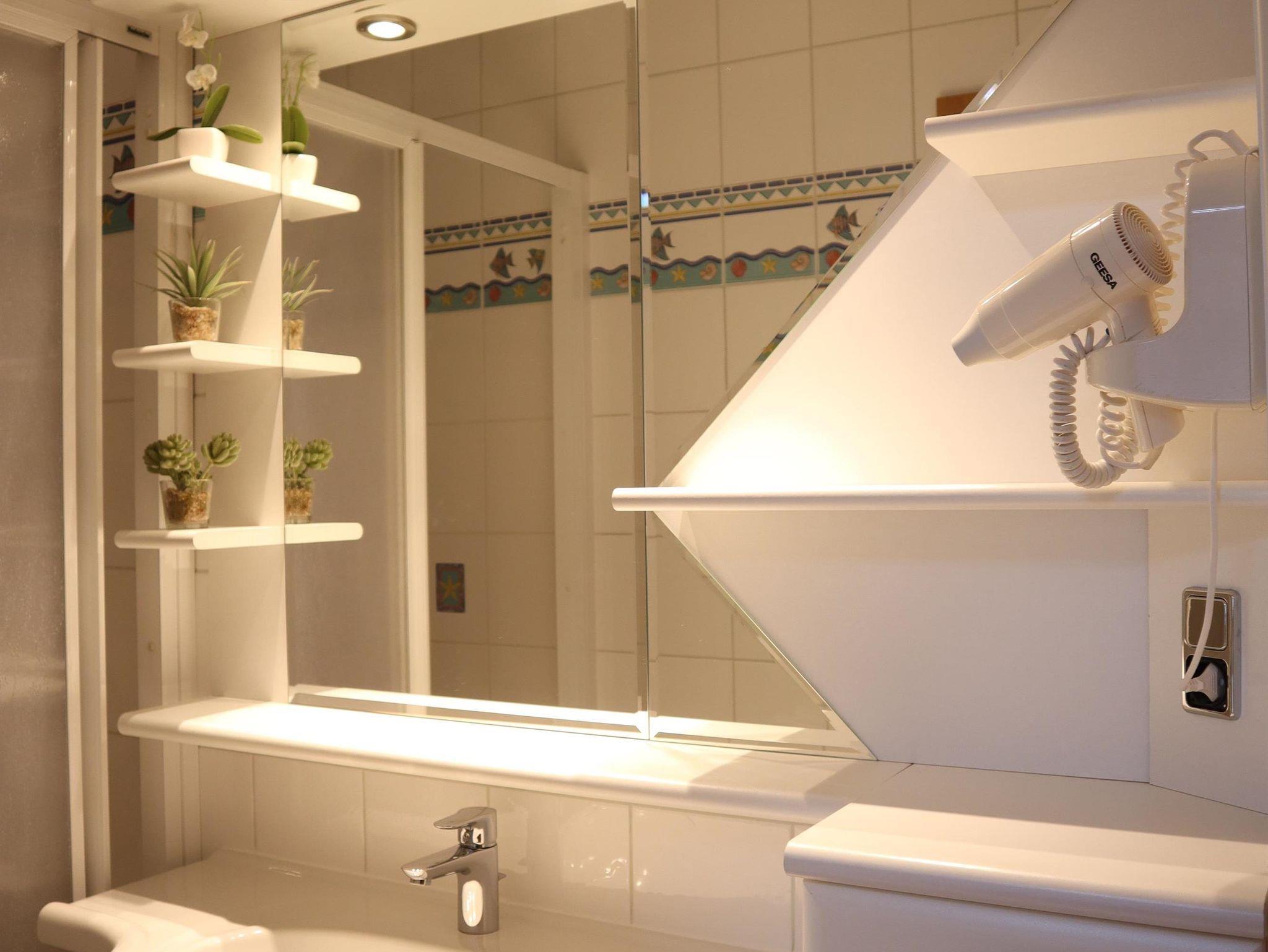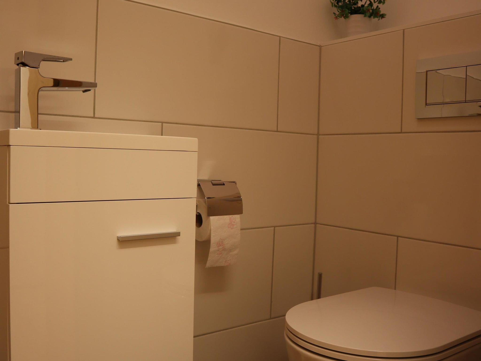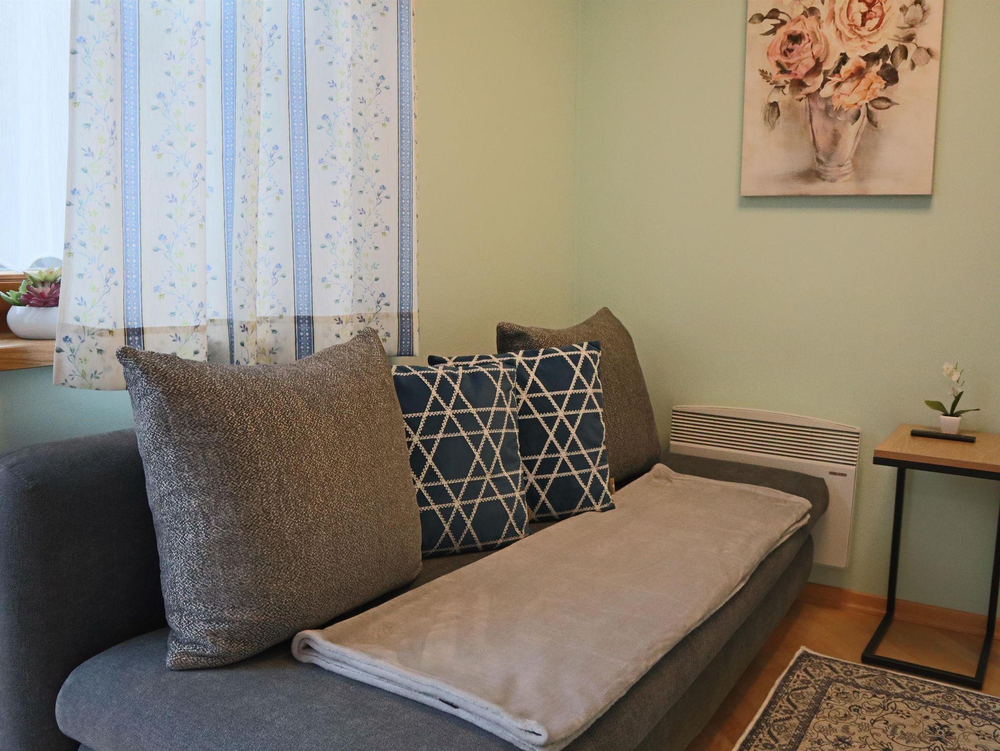 Außerdem gibt es einen Eckbank mit 2 Stühlen, eine ausziehbare Couch (max. 2 Personen) und einen Fernseher in der Wohnküche. Die Wohneinheit bietet auch einen Zugang zum Balkon. Das Appartement hat auch 1 Badezimmer mit Dusche, wo auch ein Haarföhn zur Verfügung steht und eine Toilette.