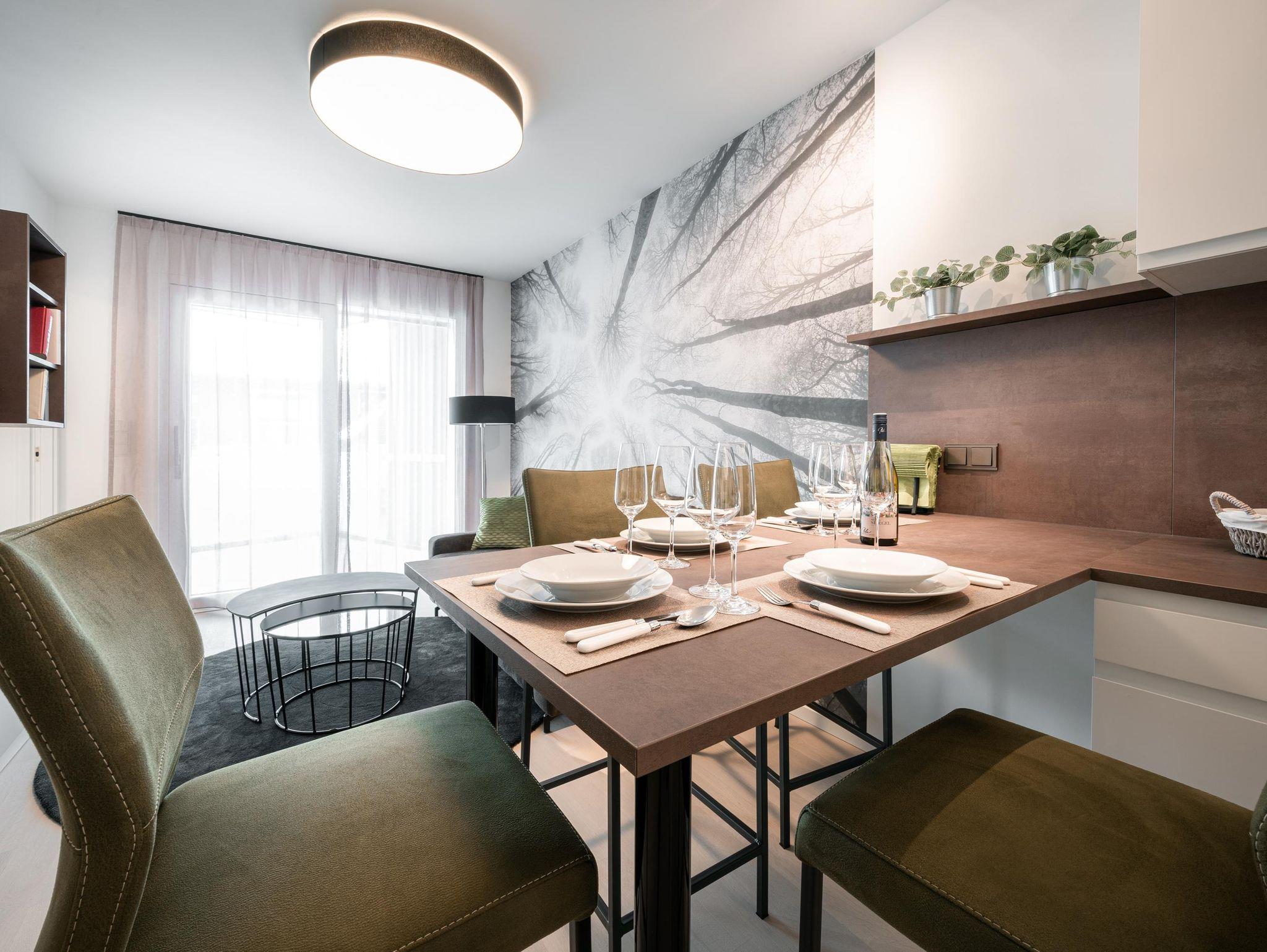 11 Appartements – von Garden, Studio, Comfort, Superior und Penthouse – jedes mit Balkon oder Terrasse, jedes ruhig, ein bis zwei Schlafzimmer, komplett ausgestattete Küchen, Tiefgarage, Skiraum, Radraum, W-Lan… das ist der Conrad – Komfort!
