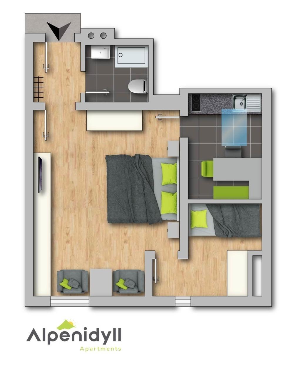 Herzlich willkommen in der Ferienwohnung City Life 4 by Alpenidyll Apartments in sehr zentraler Lage in Schladming. Sie besteht aus einem Schlafzimmer mit Doppelbett, einer Couch und einem Sitzbereich sowie Kabel-TV und einem zusätzlichen kleinen Schlafzimmer. Außerdem verfügt sie über eine extra Küche mit einem Esstisch.